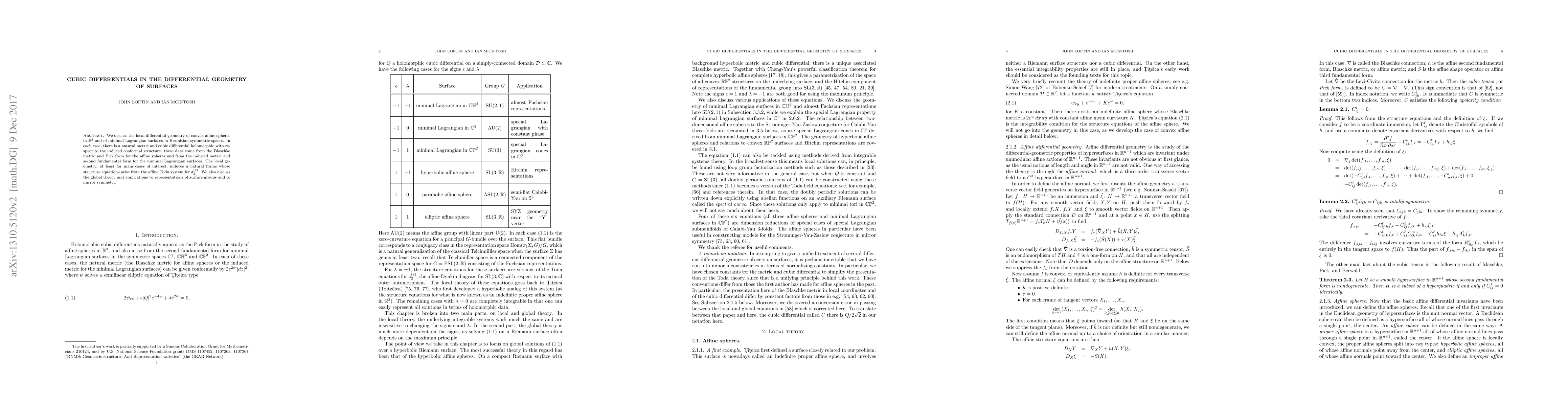 We discuss the local differential geometry of convex affine spheres in $\re^3$ and of minimal Lagrangian surfaces in Hermitian symmetric spaces. In each case, there is a natural metric and cubic differential holomorphic with respect to the induced conformal structure: these data come from the Blaschke metric and Pick form for the affine spheres and from the induced metric and second fundamental form for the minimal Lagrangian surfaces. The local geometry, at least for main cases of interest, induces a natural frame whose structure equations arise from the affine Toda system for $\mathfrak a^{(2)}_2$. We also discuss the global theory and applications to representations of surface groups and to mirror symmetry.