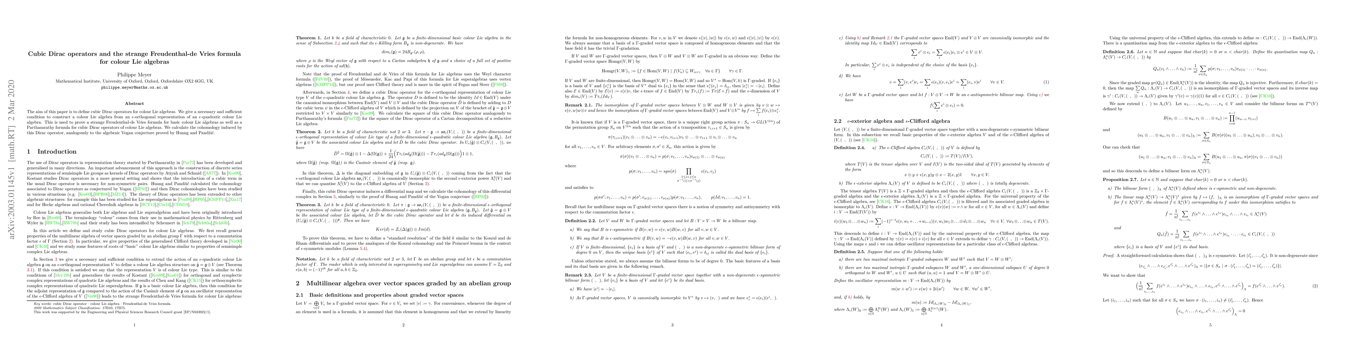 This paper defines cubic Dirac operators for colour Lie algebras, providing a necessary and sufficient condition for constructing colour Lie algebras from $\epsilon$-orthogonal representations. It proves a Freudenthal-de Vries formula and a Parthasarathy formula for these operators, along with calculating their induced cohomology.