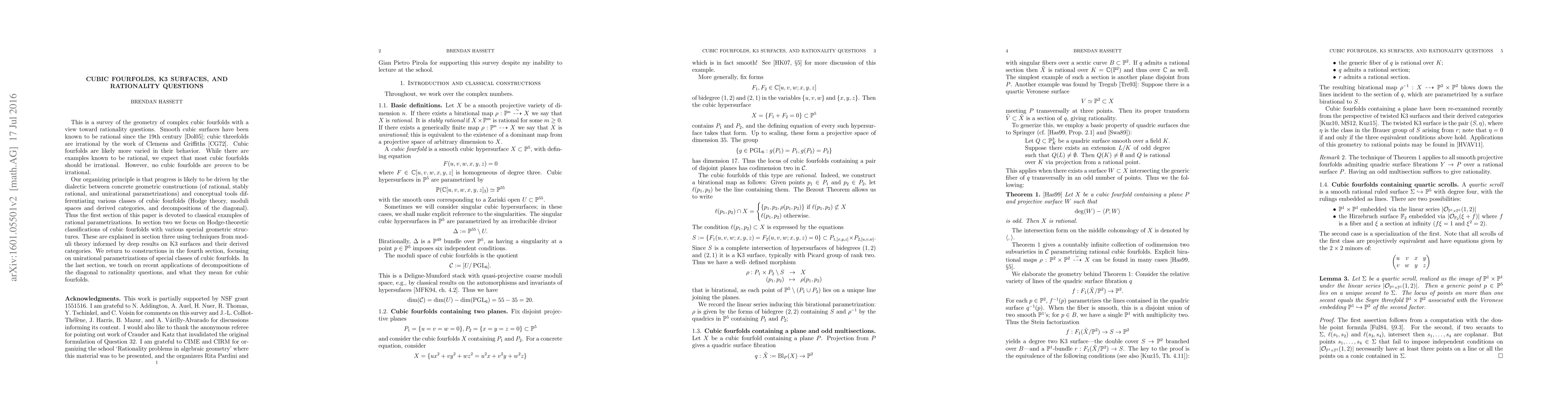 This survey explores the geometry of complex cubic fourfolds, focusing on classical rational examples and connections to K3 surfaces, while addressing rationality and unirationality questions. It highlights Hodge structures and special cubic fourfolds.
