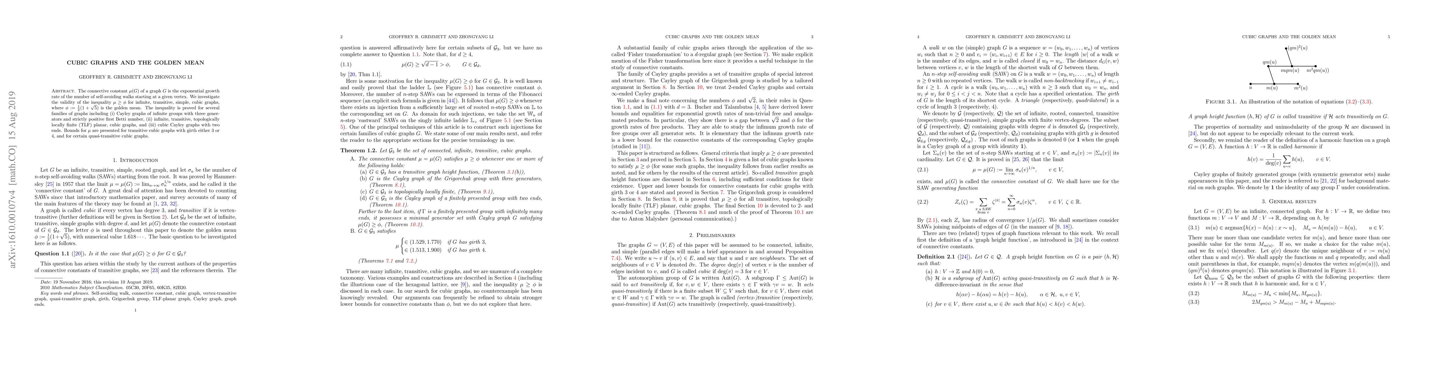 This paper proves the inequality $\mu \ge \phi$ for several classes of infinite, transitive, simple cubic graphs, where $\phi$ is the golden mean. It specifically examines Cayley graphs, TLF planar cubic graphs, and cubic Cayley graphs with two ends, presenting bounds for $\mu$ in transitive cubic graphs with girths of 3 or 4.