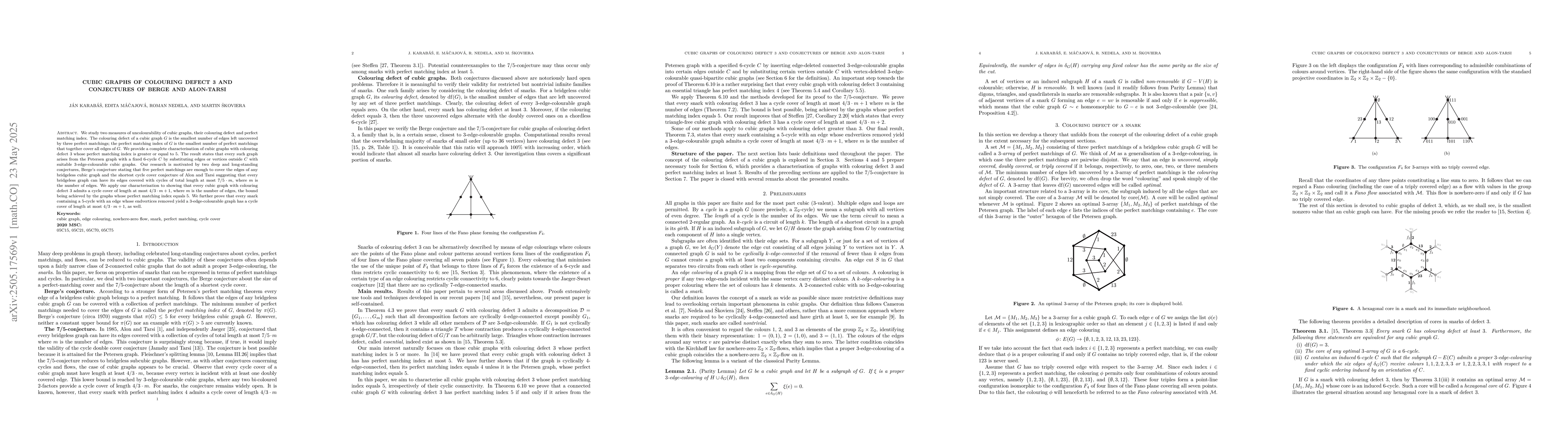 The paper presents a comprehensive characterization of cubic graphs with colouring defect 3 and perfect matching index ≥ 5, linking these properties to cycle cover bounds.