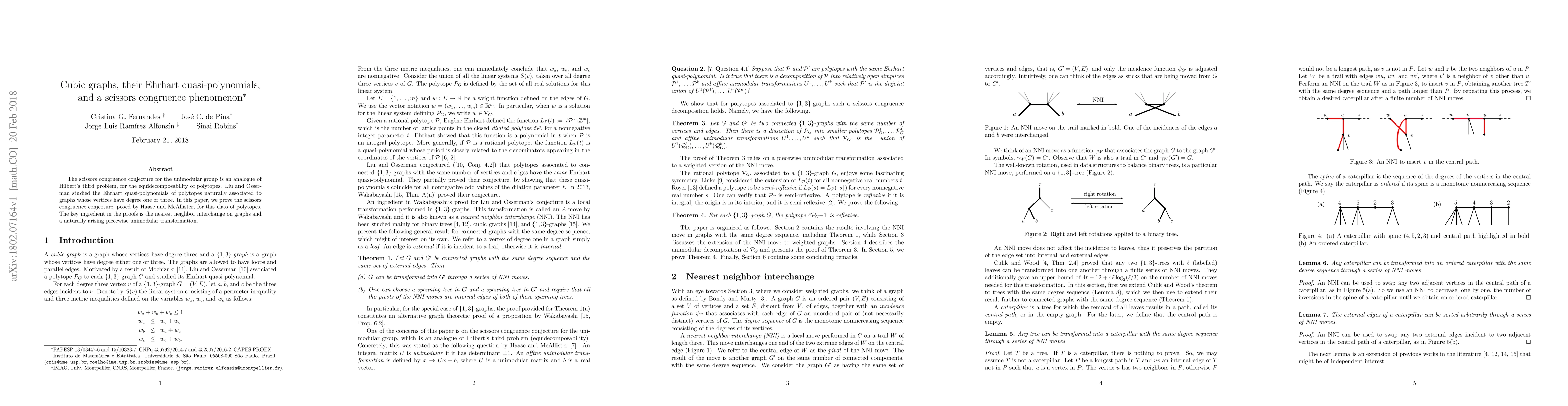 This paper proves the scissors congruence conjecture for cubic graphs, using their associated polytopes and leveraging the nearest neighbor interchange on graphs and a unique piecewise unimodular transformation. The conjecture addresses the equidecomposability of these polytopes, analogous to Hilbert's third problem.