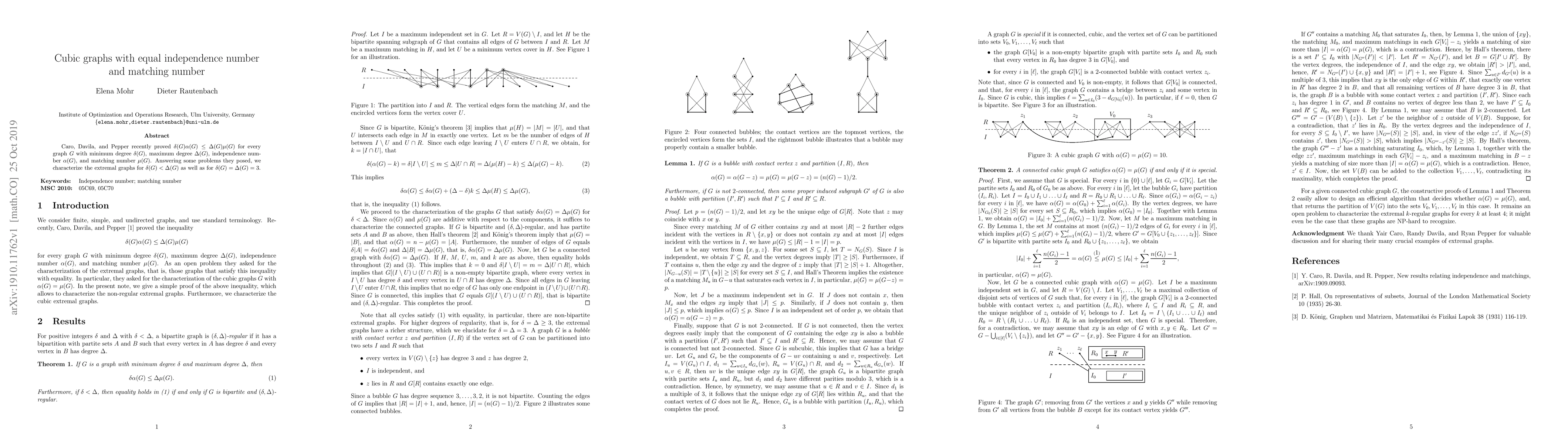 Summary: This paper investigates conditions under which cubic graphs have equal independence number and matching number, extending previous results by Caro, Davila, and Pepper, and characterizing extremal cases where the minimum and maximum degree both equal 3.