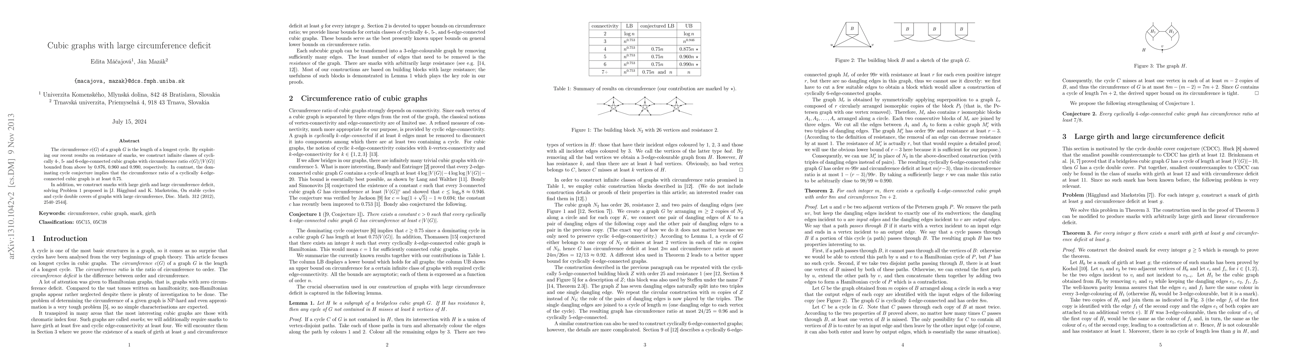 The paper constructs infinite classes of cubic graphs with significant circumference deficits, achieving ratios of 0.876, 0.960, and 0.990 for cyclically 4-, 5-, and 6-edge-connected graphs, respectively, contrasting with the conjectured minimum of 0.75. Additionally, it resolves a longstanding problem by creating snarks with large girth and large circumference deficits.