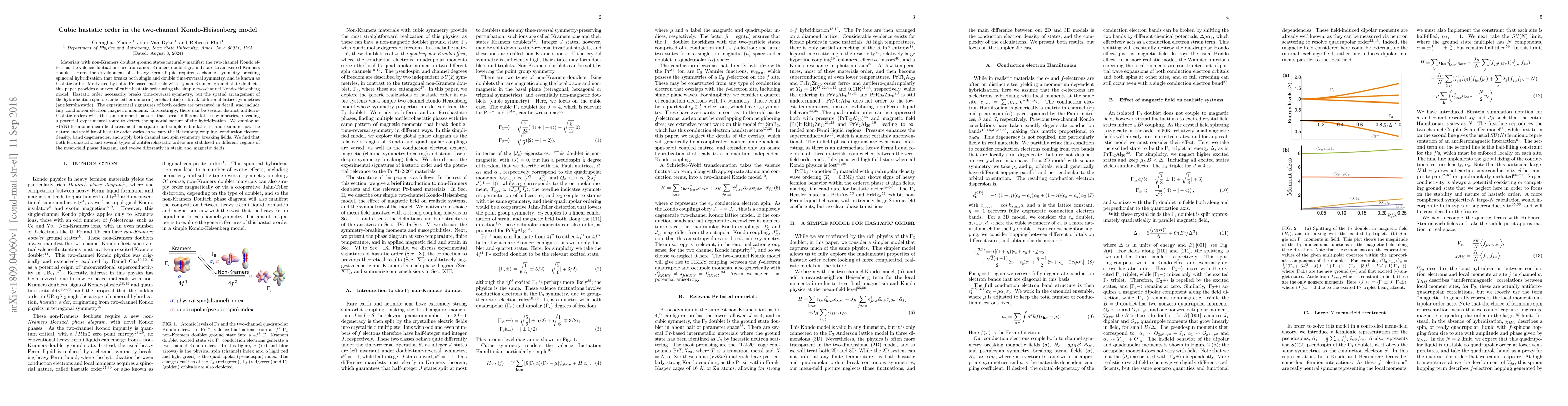 The paper presents a detailed analysis of cubic hastatic order using the two-channel Kondo-Heisenberg model, introducing a systematic study of ferrohastatic and antiferrohastatic orders, their experimental signatures, and the effect of various parameters on their stability.