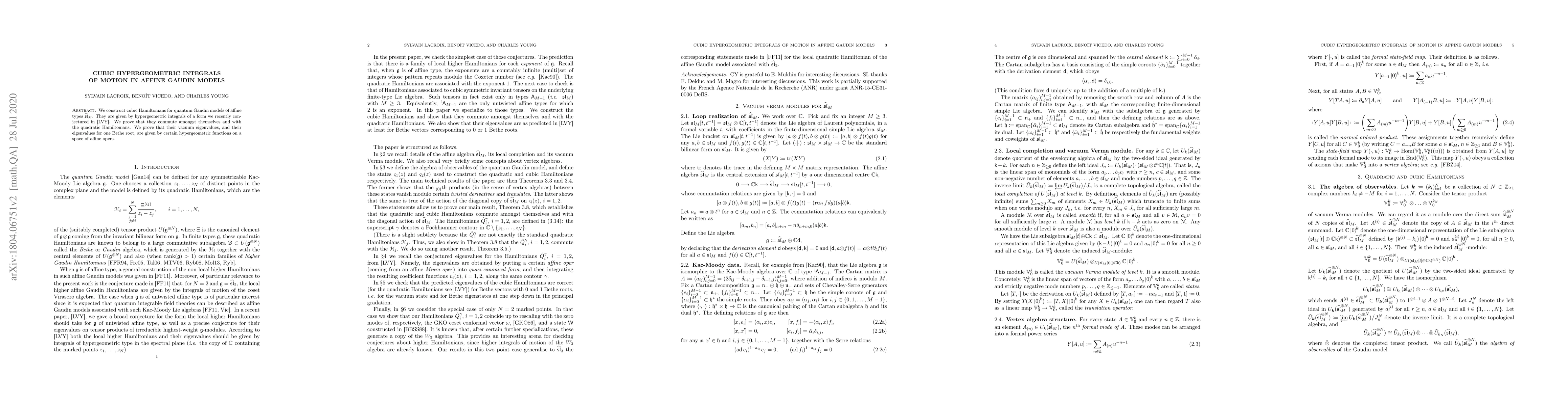 We construct cubic Hamiltonians for quantum Gaudin models of affine types $\hat{\mathfrak{sl}}_M$. They are given by hypergeometric integrals of a form we recently conjectured in arXiv:1804.01480. We prove that they commute amongst themselves and with the quadratic Hamiltonians. We prove that their vacuum eigenvalues, and their eigenvalues for one Bethe root, are given by certain hypergeometric functions on a space of affine opers.