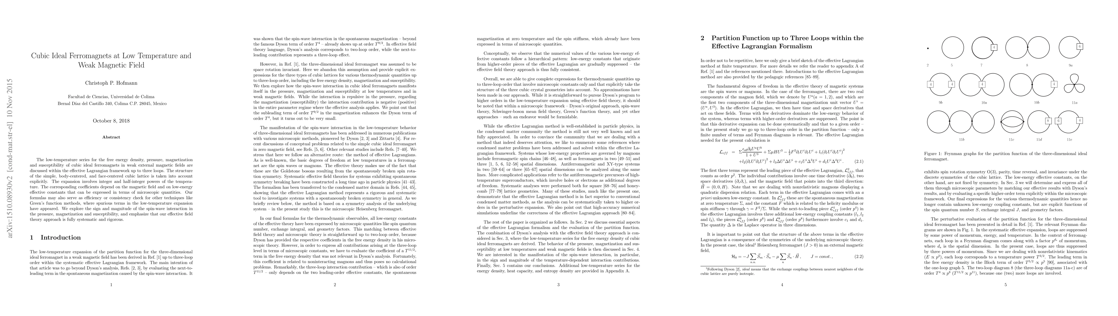 The low-temperature series for the free energy density, pressure, magnetization and susceptibility of cubic ideal ferromagnets in weak external magnetic fields are discussed within the effective Lagrangian framework up to three loops. The structure of the simple, body-centered, and face-centered cubic lattice is taken into account explicitly. The expansion involves integer and half-integer powers of the temperature. The corresponding coefficients depend on the magnetic field and on low-energy effective constants that can be expressed in terms of microscopic quantities. Our formulas may also serve as efficiency or consistency check for other techniques like Green's function methods, where spurious terms in the low-temperature expansion have appeared. We explore the sign and magnitude of the spin-wave interaction in the pressure, magnetization and susceptibility, and emphasize that our effective field theory approach is fully systematic and rigorous.