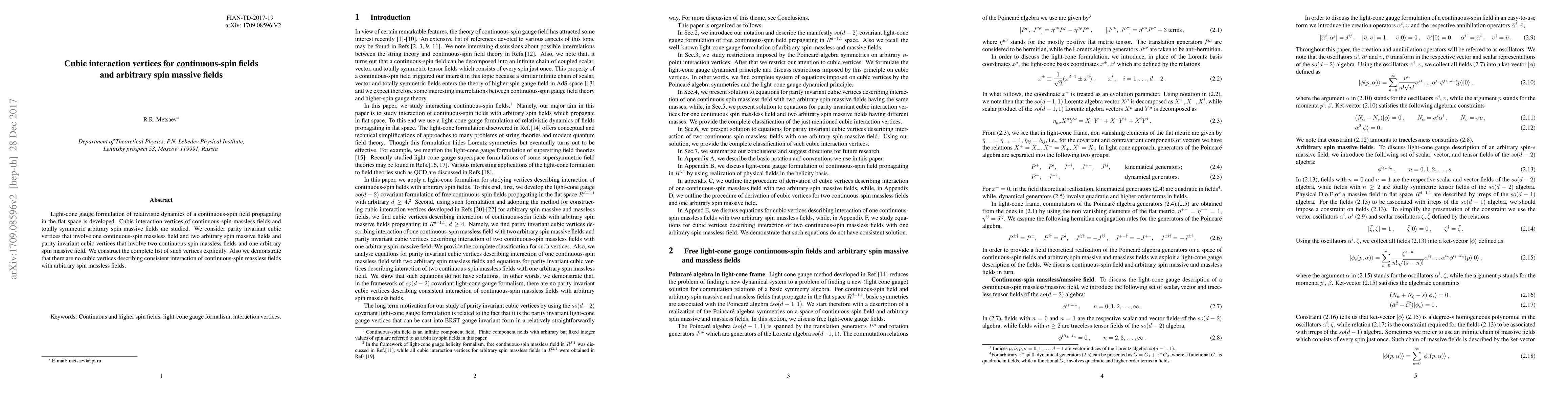 Light-cone gauge formulation of relativistic dynamics of a continuous-spin field propagating in the flat space is developed. Cubic interaction vertices of continuous-spin massless fields and totally symmetric arbitrary spin massive fields are studied. We consider parity invariant cubic vertices that involve one continuous-spin massless field and two arbitrary spin massive fields and parity invariant cubic vertices that involve two continuous-spin massless fields and one arbitrary spin massive field. We construct the complete list of such vertices explicitly. Also we demonstrate that there are no cubic vertices describing consistent interaction of continuous-spin massless fields with arbitrary spin massless fields.