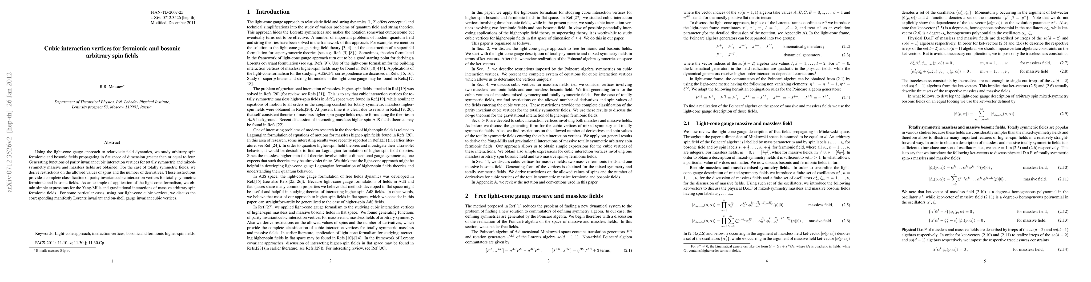 This paper employs the light-cone gauge approach to derive generating functions for parity invariant cubic interaction vertices of arbitrary spin fermionic and bosonic fields in dimensions four or higher. It provides a complete classification of these vertices for totally symmetric fields and illustrates its application through expressions for Yang-Mills and gravitational interactions.