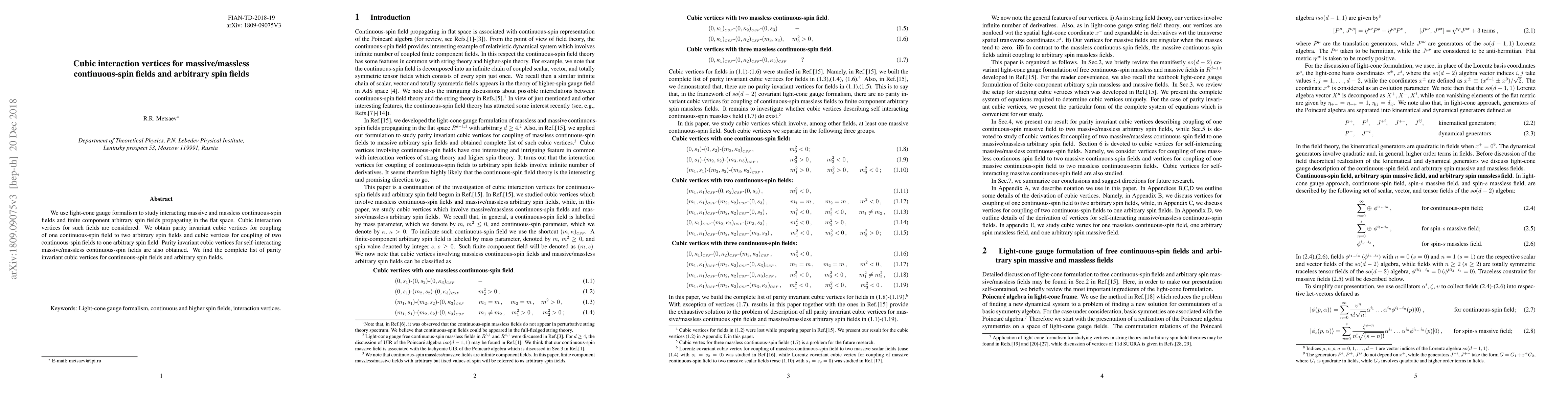 This paper employs light-cone gauge formalism to derive parity invariant cubic interaction vertices for both massive/massless continuous-spin fields and finite component arbitrary spin fields in flat space. It comprehensively identifies all such vertices for couplings between continuous-spin and arbitrary spin fields, including self-interactions.