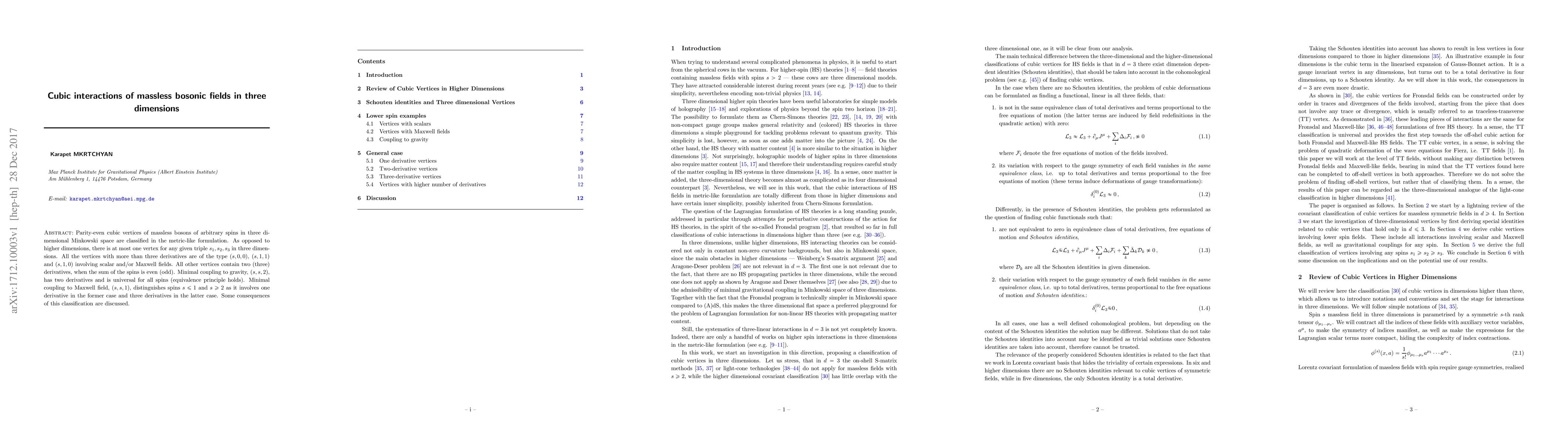 This paper classifies parity-even cubic vertices of massless bosonic fields of arbitrary spins in three-dimensional Minkowski space, revealing that only one vertex exists for any given triple of spins in this dimension. The study highlights the unique nature of interactions in three dimensions, particularly the minimal coupling to gravity and Maxwell fields.