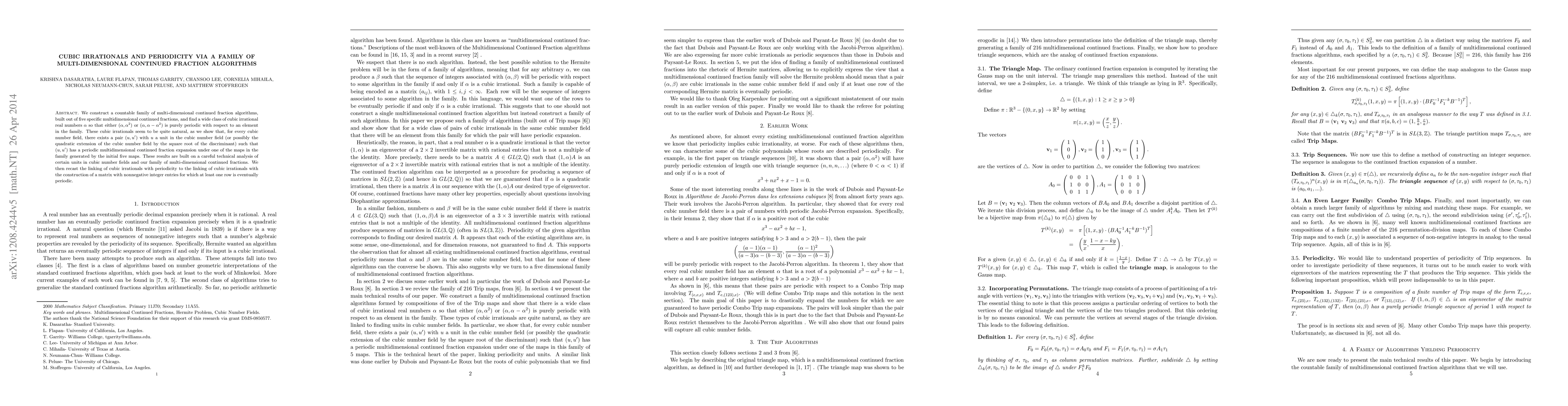 This paper constructs a family of multi-dimensional continued fraction algorithms and identifies cubic irrationals whose representations under these algorithms exhibit periodic behavior. It links the periodicity of these irrationals to the existence of periodic rows in matrices with nonnegative integer entries.