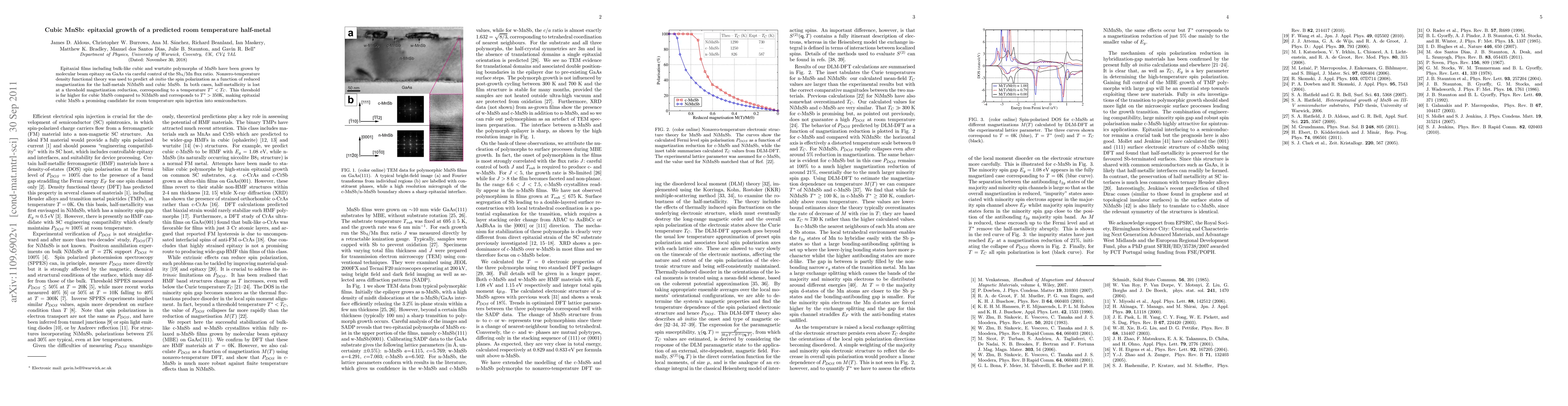 Epitaxial films including bulk-like cubic and wurtzite polymorphs of MnSb have been grown by molecular beam epitaxy on GaAs via careful control of the Sb4/Mn flux ratio. Nonzero-temperature density functional theory was used to predict ab initio the spin polarization as a function of reduced magnetization for the half-metals NiMnSb and cubic MnSb. In both cases, half-metallicity is lost at a threshold magnetization reduction, corresponding to a temperature T*< Tc. This threshold is far higher for cubic MnSb compared to NiMnSb and corresponds to T* > 350K, making epitaxial cubic MnSb a promising candidate for room temperature spin injection into semiconductors.