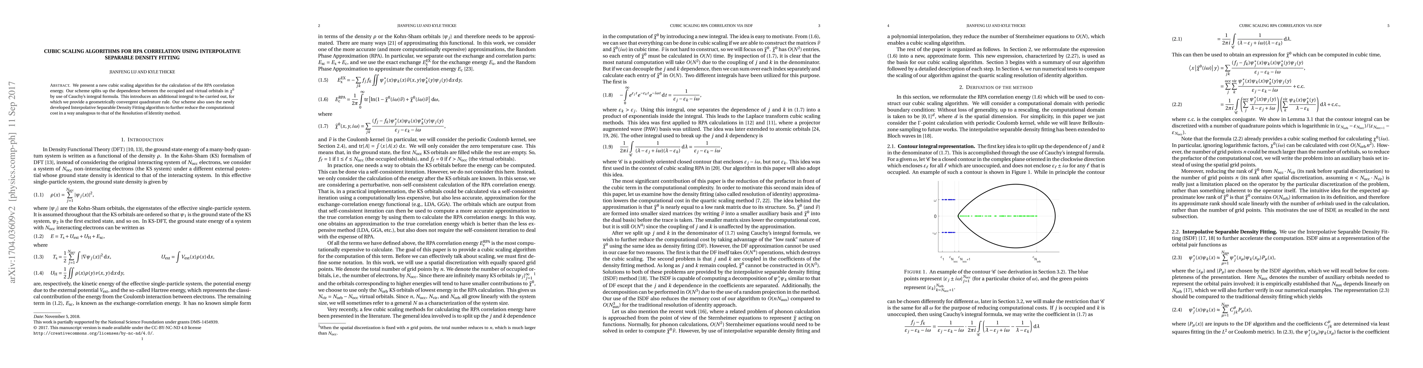 This paper introduces a cubic scaling algorithm for calculating RPA correlation energy using Cauchy's integral formula and interpolative separable density fitting, which reduces computational cost and employs a geometrically convergent quadrature rule.