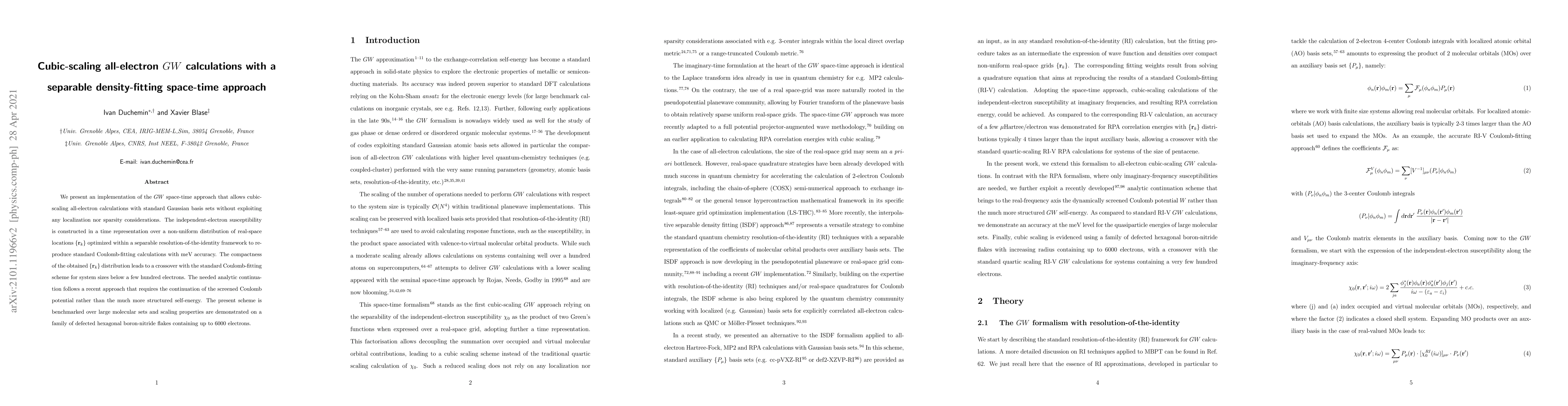 The research presents a cubic-scaling all-electron GW calculation method using a separable density-fitting space-time approach, which does not rely on localization or sparsity considerations. It constructs the independent-electron susceptibility in a time representation over a non-uniform distribution of real-space locations optimized within a separable resolution-of-the-identity framework.