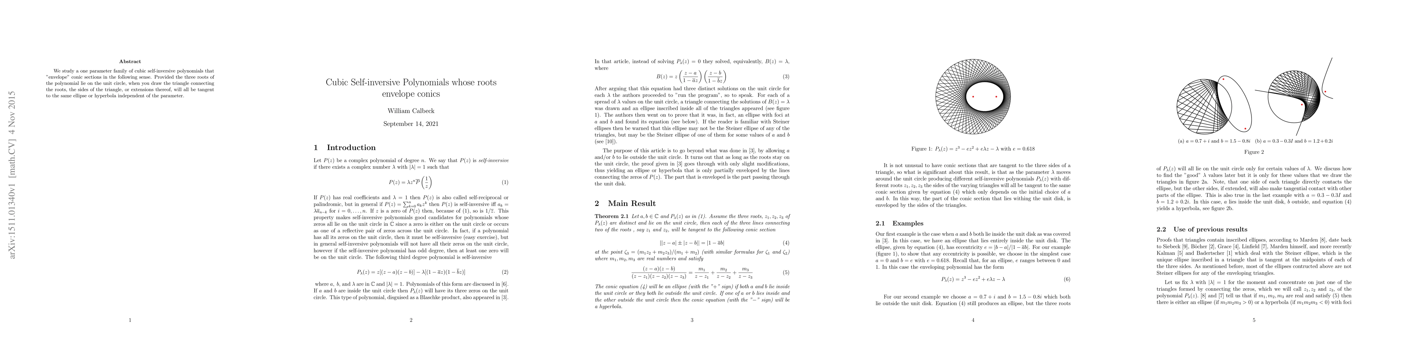 We study a one parameter family of cubic self-inversive polynomials that "envelope" conic sections in the following sense. Provided the three roots of the polynomial lie on the unit circle, when you draw the triangle connecting the roots, the sides of the triangle, or extensions thereof, will all be tangent to the same ellipse or hyperbola independent of the parameter.