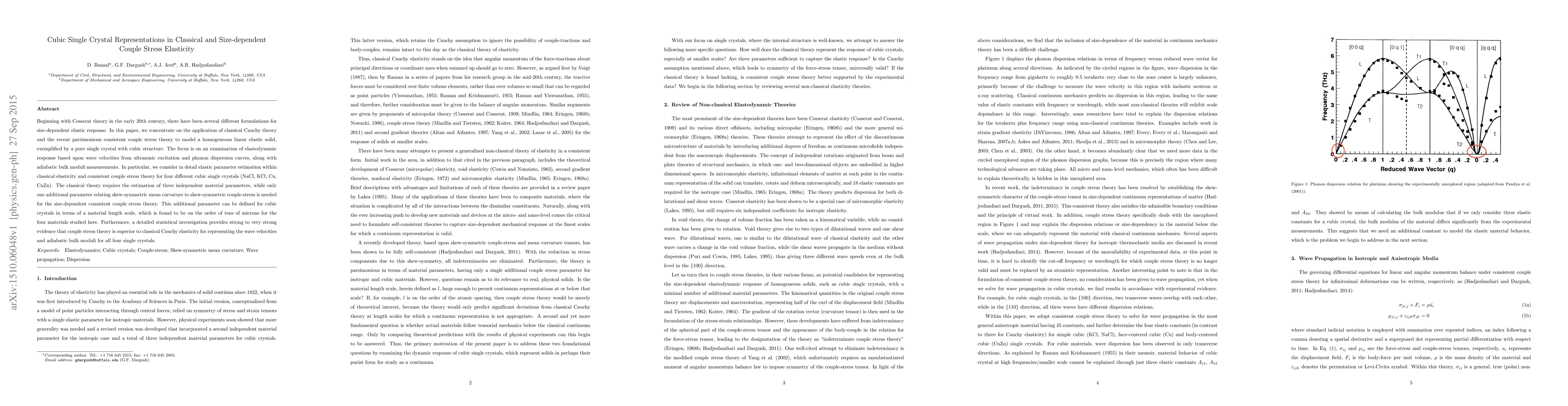 This paper compares classical Cauchy elasticity and size-dependent couple stress theory in modeling cubic single crystals, finding that couple stress theory, requiring an additional material length scale parameter, better represents wave velocities and bulk moduli for materials like NaCl, KCl, Cu, and CuZn.