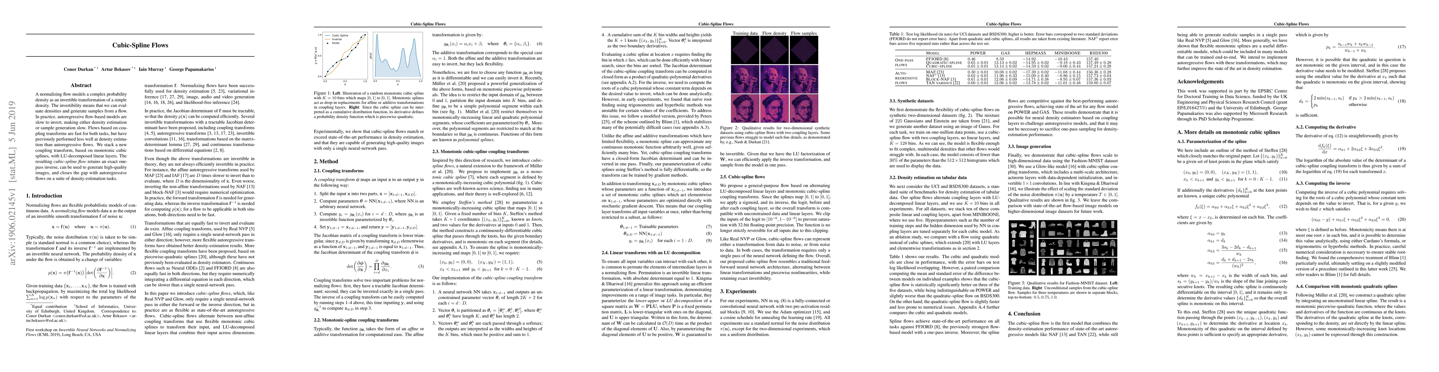 A normalizing flow models a complex probability density as an invertible transformation of a simple density. The invertibility means that we can evaluate densities and generate samples from a flow. In practice, autoregressive flow-based models are slow to invert, making either density estimation or sample generation slow. Flows based on coupling transforms are fast for both tasks, but have previously performed less well at density estimation than autoregressive flows. We stack a new coupling transform, based on monotonic cubic splines, with LU-decomposed linear layers. The resulting cubic-spline flow retains an exact one-pass inverse, can be used to generate high-quality images, and closes the gap with autoregressive flows on a suite of density-estimation tasks.