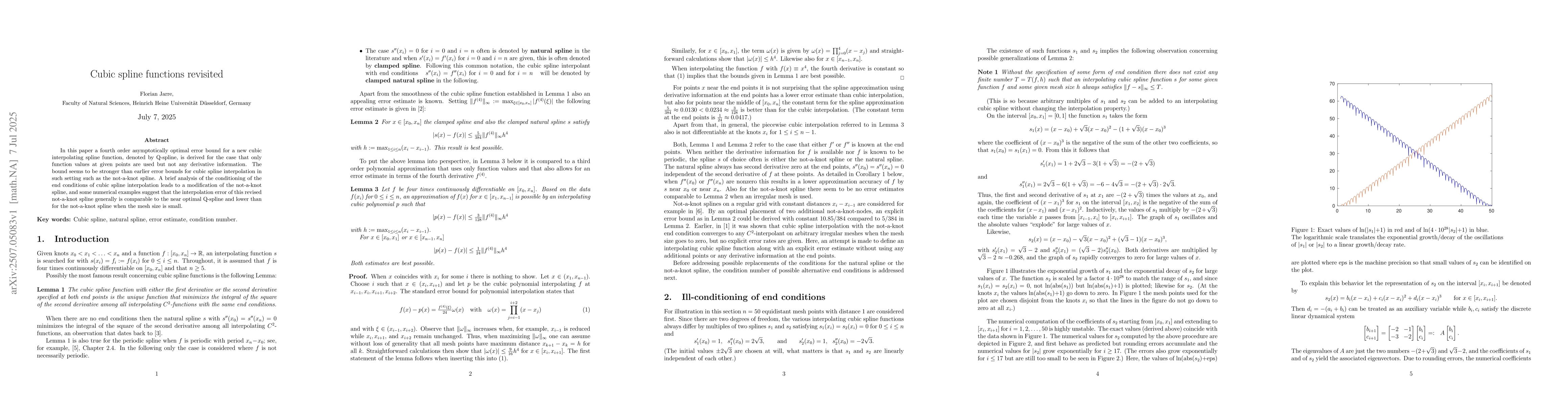 In this paper a fourth order asymptotically optimal error bound for a new cubic interpolating spline function, denoted by Q-spline, is derived for the case that only function values at given points are used but not any derivative information. The bound seems to be stronger than earlier error bounds for cubic spline interpolation in such setting such as the not-a-knot spline. A brief analysis of the conditioning of the end conditions of cubic spline interpolation leads to a modification of the not-a-knot spline, and some numerical examples suggest that the interpolation error of this revised not-a-knot spline generally is comparable to the near optimal Q-spline and lower than for the not-a-knot spline when the mesh size is small.