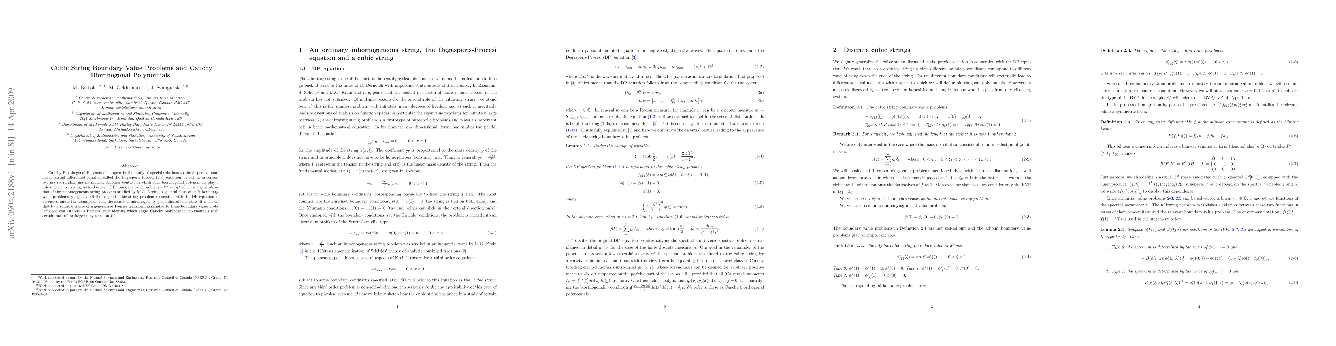 This paper explores cubic string boundary value problems and their connection to Cauchy biorthogonal polynomials, which are significant in solving the Degasperis-Procesi equation and in two-matrix random matrix models. The study establishes a Parseval type identity linking these biorthogonal polynomials to natural orthogonal systems on L^2_g through a generalized Fourier transform.