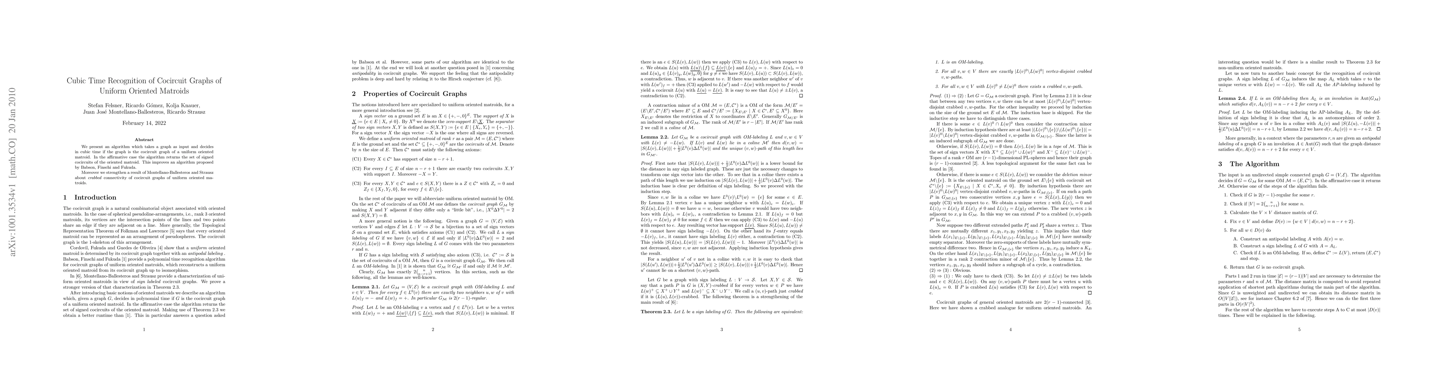 Summary: This paper introduces a cubic-time algorithm to determine if a given graph is the cocircuit graph of a uniform oriented matroid, enhancing an existing algorithm, and reinforces results on the Crabbed connectivity of such cocircuit graphs.