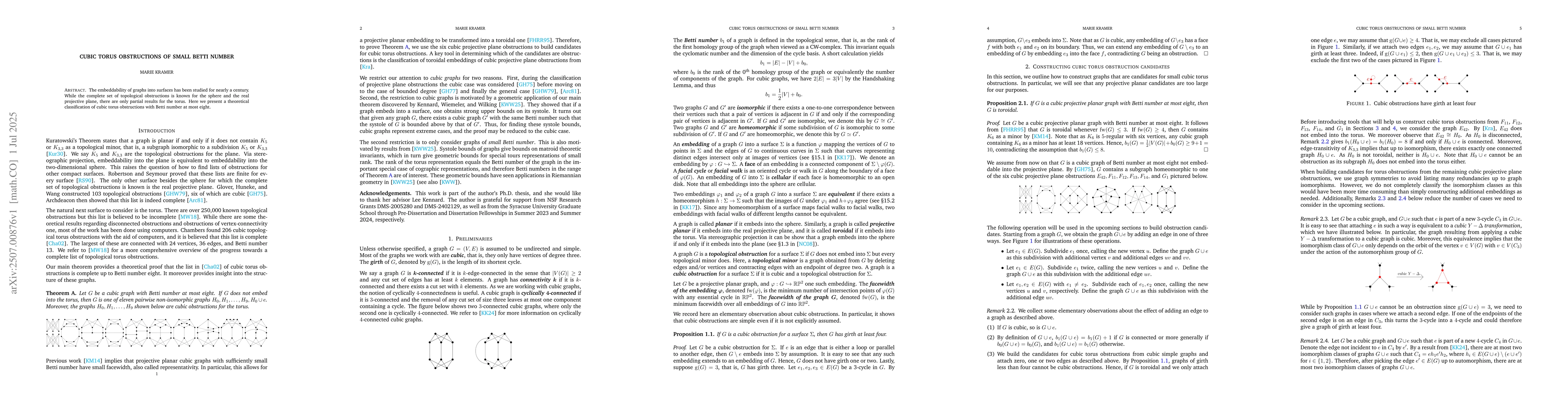 The embeddability of graphs into surfaces has been studied for nearly a century. While the complete set of topological obstructions is known for the sphere and the real projective plane, there are only partial results for the torus. Here we present a theoretical classification of cubic torus obstructions with Betti number at most eight.