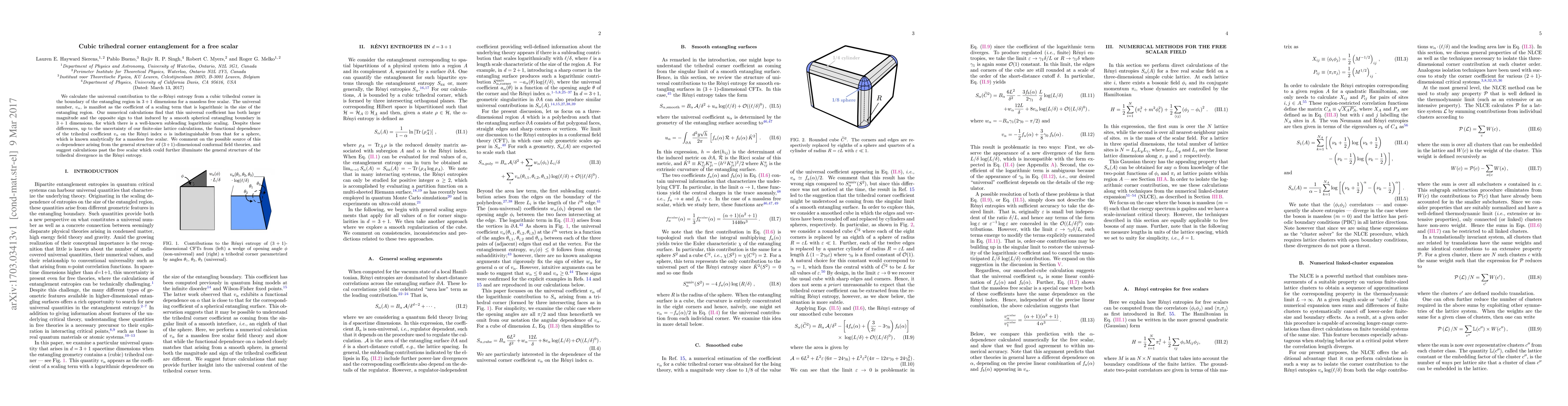 This paper calculates the universal contribution to the $\alpha$-Renyi entropy from a cubic trihedral corner in 3+1 dimensions for a massless free scalar, finding a universal coefficient with opposite sign and larger magnitude compared to a smooth spherical boundary. Despite differences, the functional dependence on the Renyi index $\alpha$ is similar to that for a sphere.