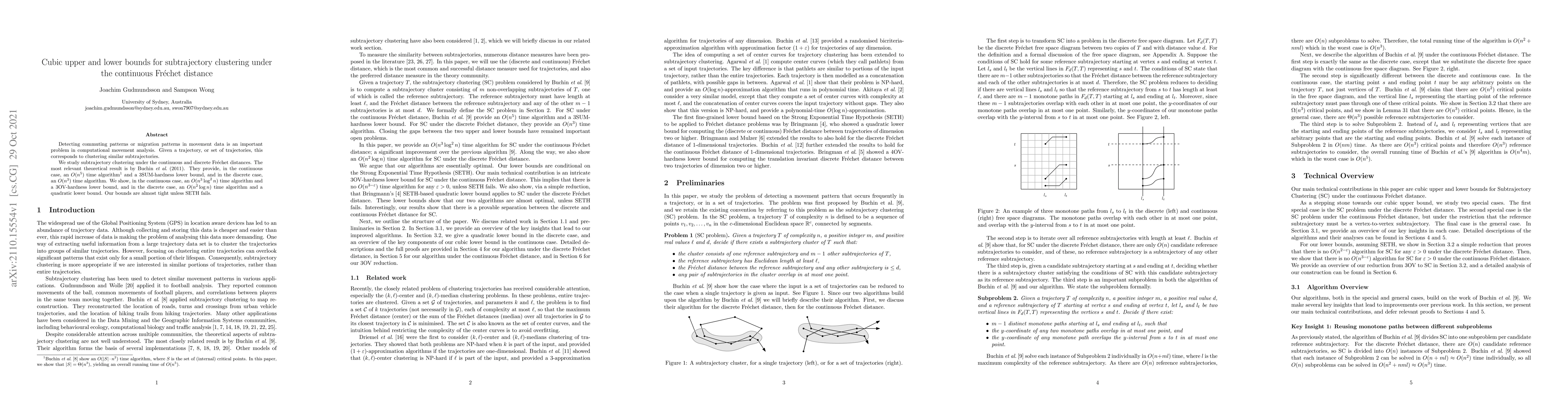 This research improves algorithms for clustering similar segments of movement data (subtrajectories) under continuous and discrete Fréchet distance metrics. In the continuous case, it presents an $O(n^3 log^2 n)$ time algorithm with a 3OV-hardness lower bound, and in the discrete case, an $O(n^2 log n)$ time algorithm with a quadratic lower bound. These bounds are nearly tight, assuming the Strong Exponential Time Hypothesis (SETH) does not hold.