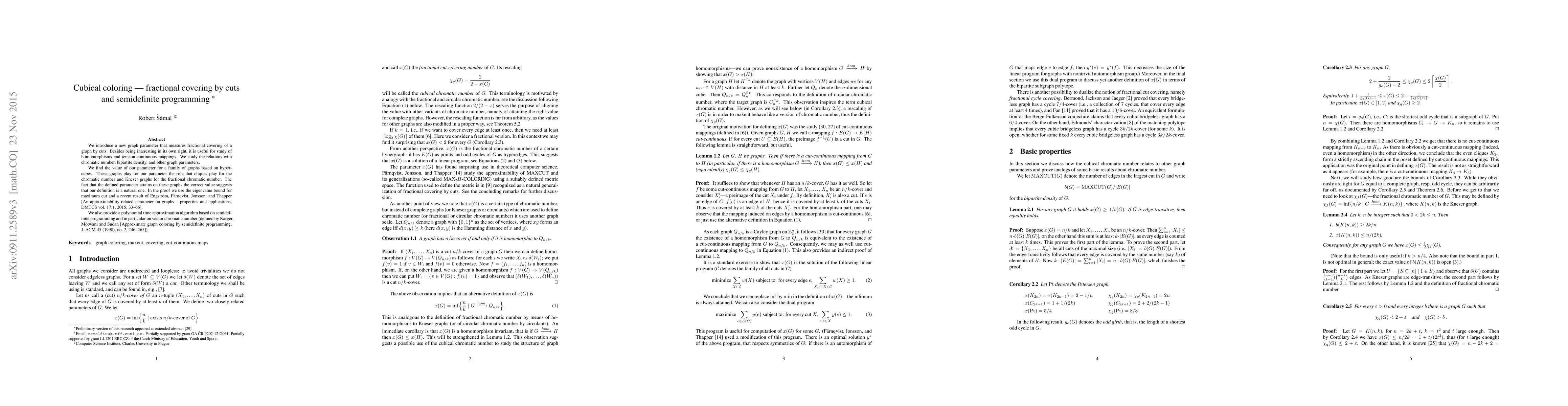 We introduce a new graph invariant that measures fractional covering of a graph by cuts. Besides being interesting in its own right, it is useful for study of homomorphisms and tension-continuous mappings. We study the relations with chromatic number, bipartite density, and other graph parameters. We find the value of our parameter for a family of graphs based on hypercubes. These graphs play for our parameter the role that circular cliques play for the circular chromatic number. The fact that the defined parameter attains on these graphs the `correct' value suggests that the definition is a natural one. In the proof we use the eigenvalue bound for maximum cut and a recent result of Engstr\"om, F\"arnqvist, Jonsson, and Thapper. We also provide a polynomial time approximation algorithm based on semidefinite programming and in particular on vector chromatic number (defined by Karger, Motwani and Sudan [Approximate graph coloring by semidefinite programming, J. ACM 45 (1998), no. 2, 246--265]).