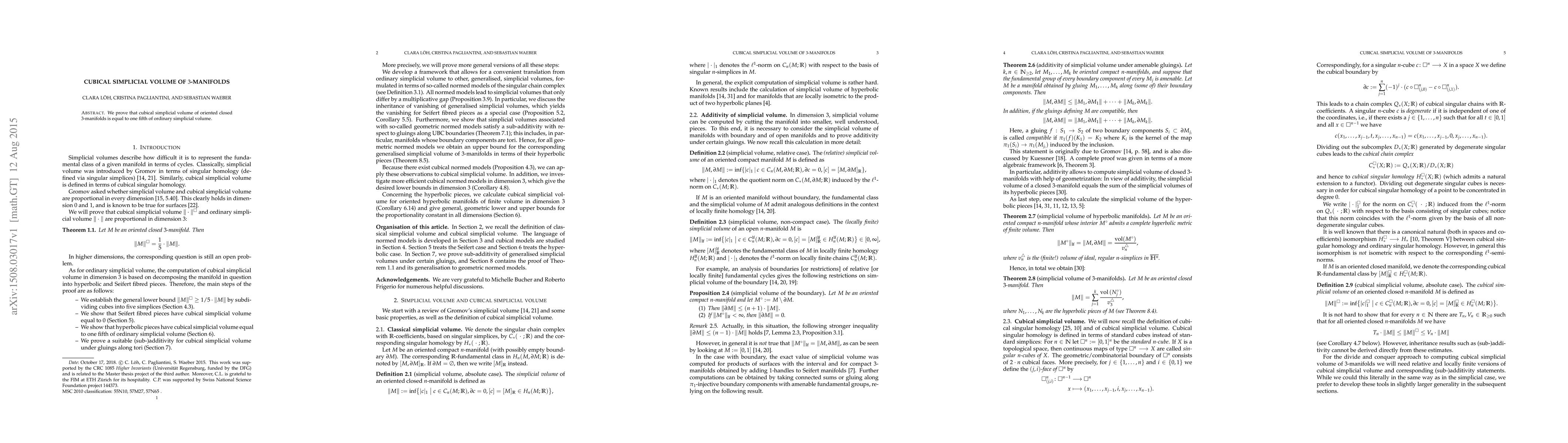 Summary: The paper establishes that the cubical simplicial volume of any oriented closed 3-manifold is exactly one fifth of its ordinary simplicial volume. This finding bridges two distinct approaches to measuring the topological complexity of 3-manifolds.