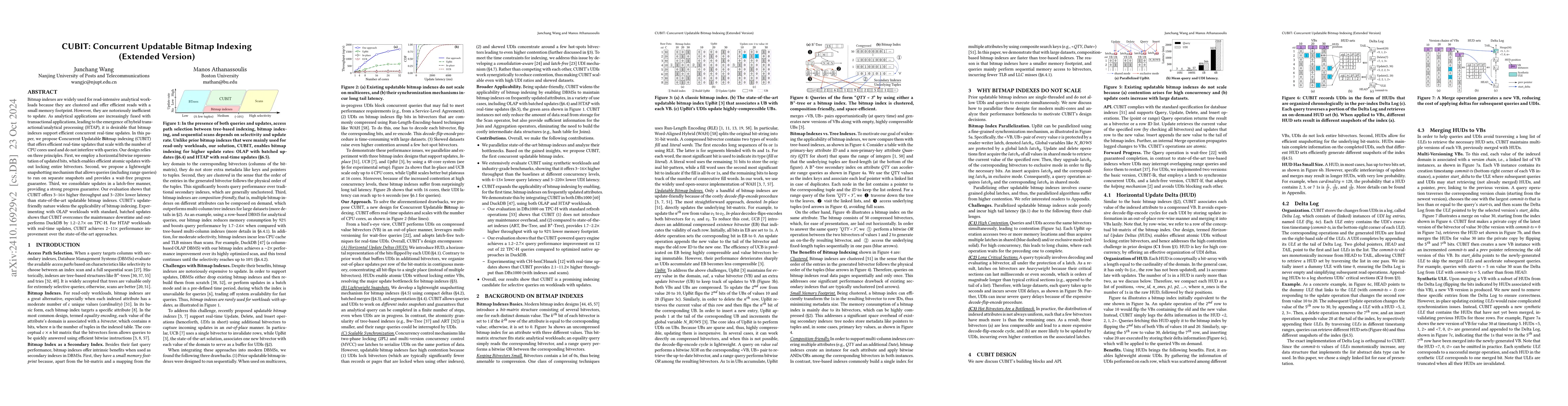 CUBIT introduces an innovative concurrent updatable bitmap indexing technique that enhances the efficiency of real-time updates in bitmap indexes without hindering query performance. Evaluations reveal CUBIT achieves significantly higher throughput and lower latency compared to existing methods, outperforming both standard OLAP workloads and hybrid transactional/analytical processing tasks.