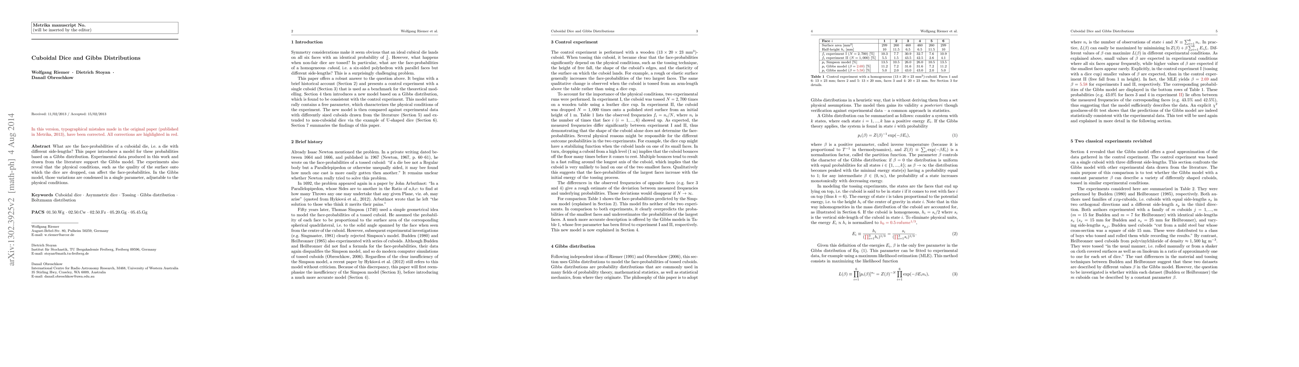 What are the face-probabilities of a cuboidal die, i.e. a die with different side-lengths? This paper introduces a model for these probabilities based on a Gibbs distribution. Experimental data produced in this work and drawn from the literature support the Gibbs model. The experiments also reveal that the physical conditions, such as the quality of the surface onto which the dice are dropped, can affect the face-probabilities. In the Gibbs model, those variations are condensed in a single parameter, adjustable to the physical conditions.