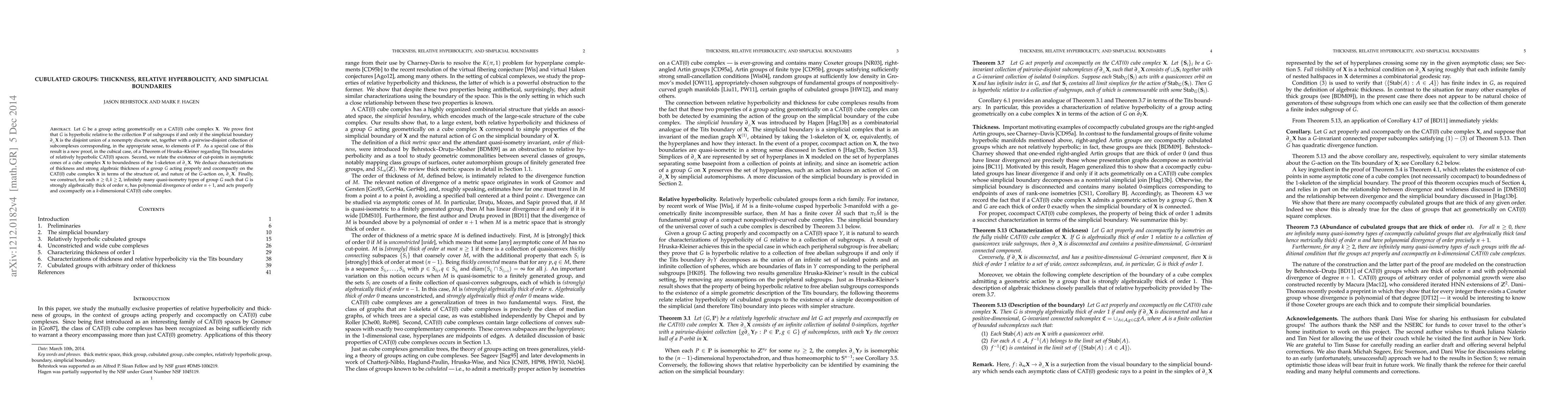 A group acting geometrically on a CAT(0) cube complex is hyperbolic relative to subgroups if its boundary's simplicial structure matches specific conditions. The paper also explores implications for thickness, strong algebraic thickness, and quasi-isometry types of groups.