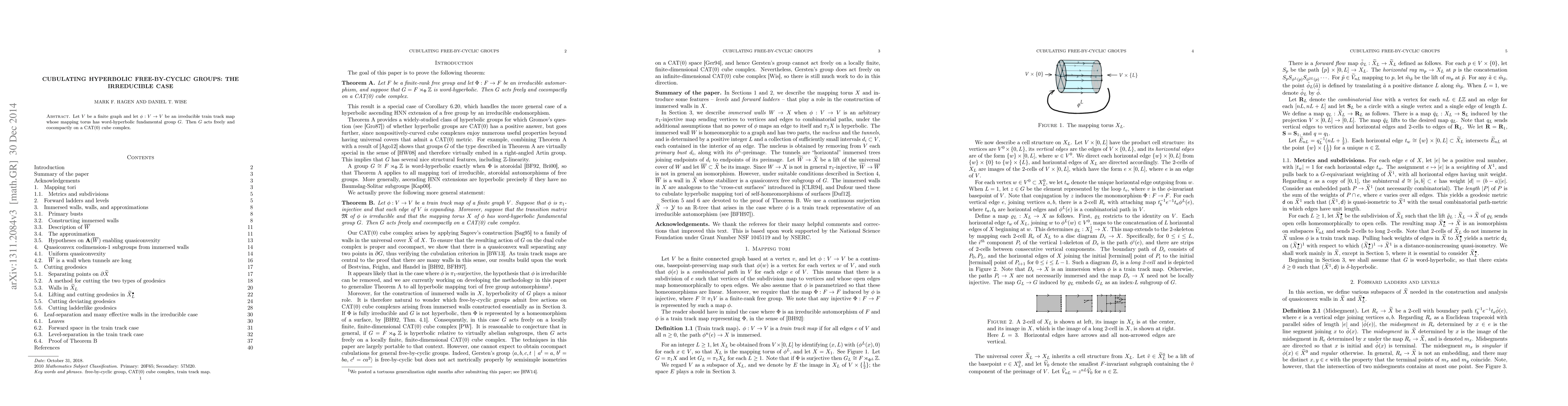 Let $V$ be a finite graph and let $\phi:V\rightarrow V$ be an irreducible train track map whose mapping torus has word-hyperbolic fundamental group $G$. Then $G$ acts freely and cocompactly on a CAT(0) cube complex.