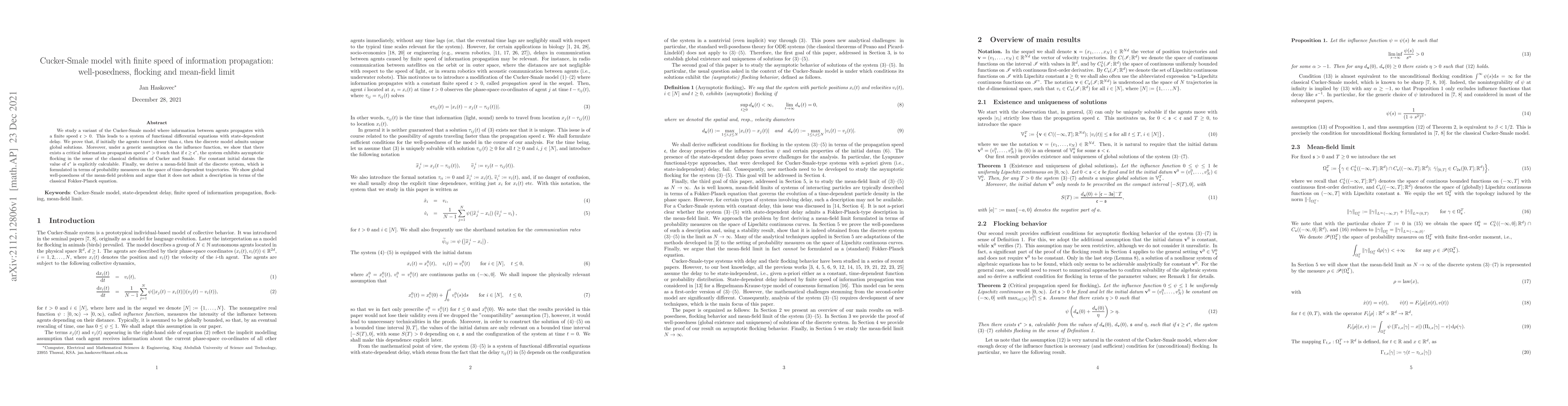 We study a variant of the Cucker-Smale model where information between agents propagates with a finite speed $\mathfrak{c}>0$. This leads to a system of functional differential equations with state-dependent delay. We prove that, if initially the agents travel slower than $c$, then the discrete model admits unique global solutions. Moreover, under a generic assumption on the influence function, we show that there exists a critical information propagation speed $\mathfrak{c}^\ast>0$ such that if $\mathfrak{c}\geq\mathfrak{c}^\ast$, the system exhibits asymptotic flocking in the sense of the classical definition of Cucker and Smale. For constant initial datum the value of $\mathfrak{c}^\ast$ is explicitly calculable. Finally, we derive a mean-field limit of the discrete system, which is formulated in terms of probability measures on the space of time-dependent trajectories. We show global well-posedness of the mean-field problem and argue that it does not admit a description in terms of the classical Fokker-Planck equation.