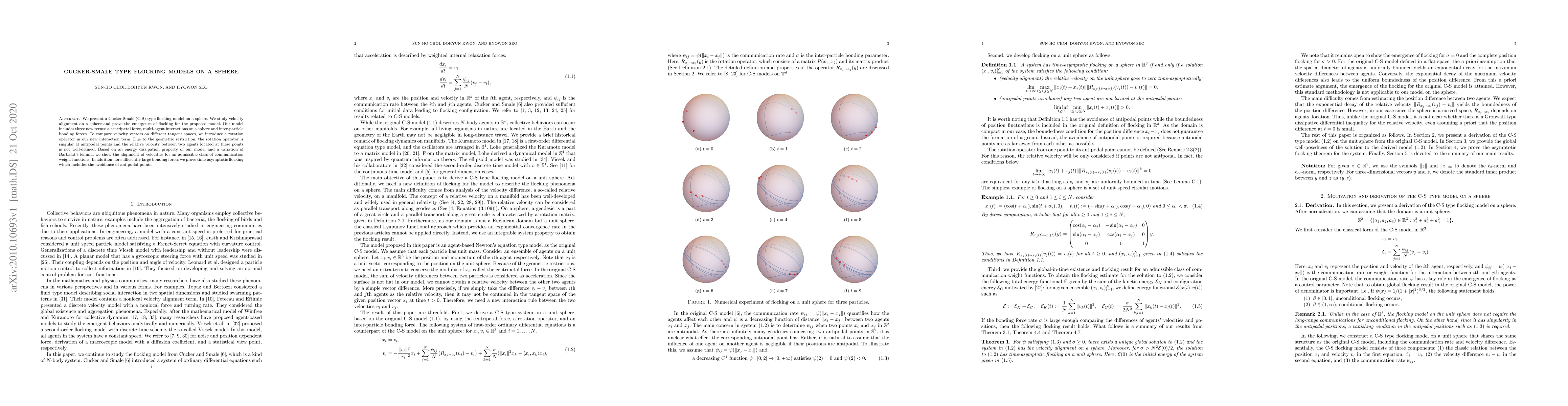 This paper proposes a Cucker-Smale flocking model on a spherical surface, incorporating centripetal force, multi-agent interactions, and inter-particle bonding forces. It demonstrates velocity alignment and time-asymptotic flocking, while addressing the singularity issue at antipodal points through an energy dissipation property and a modified Barbalat's lemma.