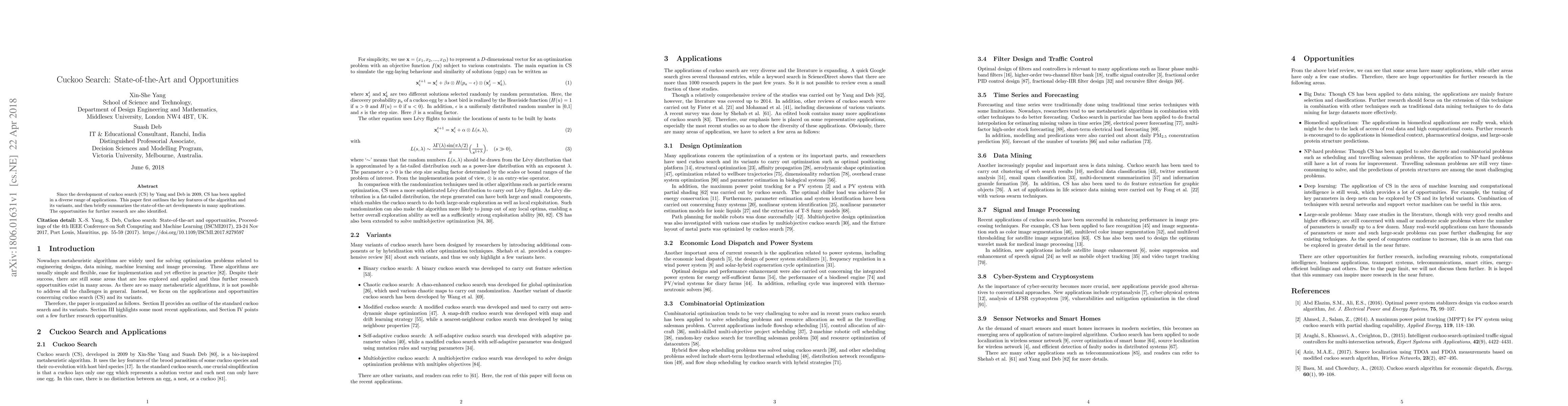 Since the development of cuckoo search (CS) by Yang and Deb in 2009, CS has been applied in a diverse range of applications. This paper first outlines the key features of the algorithm and its variants, and then briefly summarizes the state-of-the-art developments in many applications. The opportunities for further research are also identified.