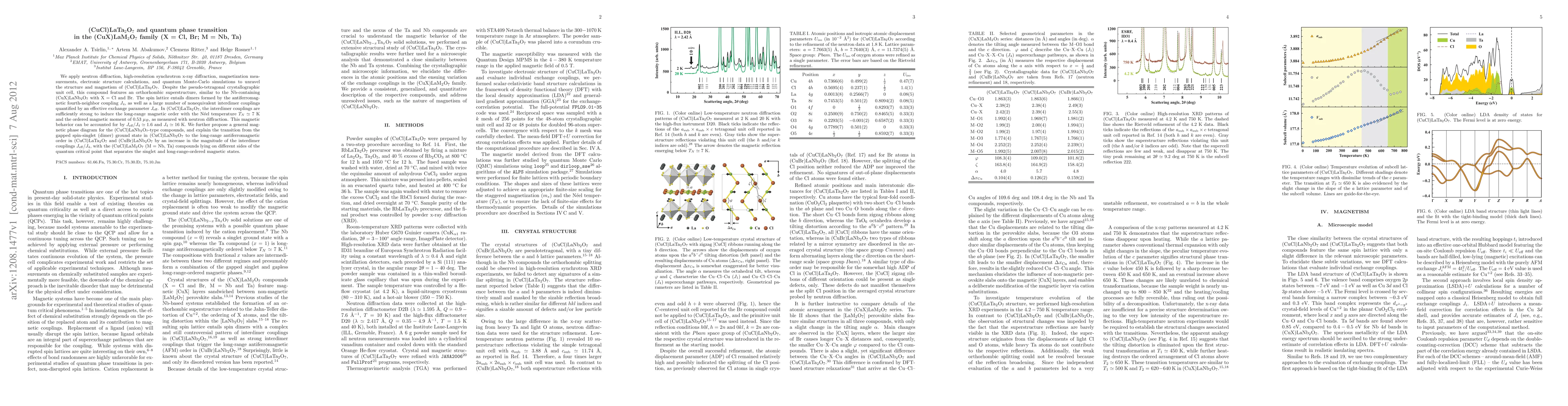 We apply neutron diffraction, high-resolution synchrotron x-ray diffraction, magnetization measurements, electronic structure calculations, and quantum Monte-Carlo simulations to unravel the structure and magnetism of (CuCl)LaTa2O7. Despite the pseudo-tetragonal crystallographic unit cell, this compound features an orthorhombic superstructure, similar to the Nb-containing (CuX)LaNb2O7 with X = Cl and Br. The spin lattice entails dimers formed by the antiferromagnetic fourth-neighbor coupling J4, as well as a large number of nonequivalent interdimer couplings quantified by an effective exchange parameter Jeff. In (CuCl)LaTa2O7, the interdimer couplings are sufficiently strong to induce the long-range magnetic order with the Neel temperature TN~7 K and the ordered magnetic moment of 0.53 mu_B, as measured with neutron diffraction. This magnetic behavior can be accounted for by Jeff/J4~1.6 and J4~16 K. We further propose a general magnetic phase diagram for the (CuCl)LaNb2O7-type compounds, and explain the transition from the gapped spin-singlet (dimer) ground state in (CuCl)LaNb2O7 to the long-range antiferromagnetic order in (CuCl)LaTa2O7 and (CuBr)LaNb2O7 by an increase in the magnitude of the interdimer couplings Jeff/J_4, with the (CuCl)LaM2O7 (M = Nb, Ta) compounds lying on different sides of the quantum critical point that separates the singlet and long-range-ordered magnetic ground states.