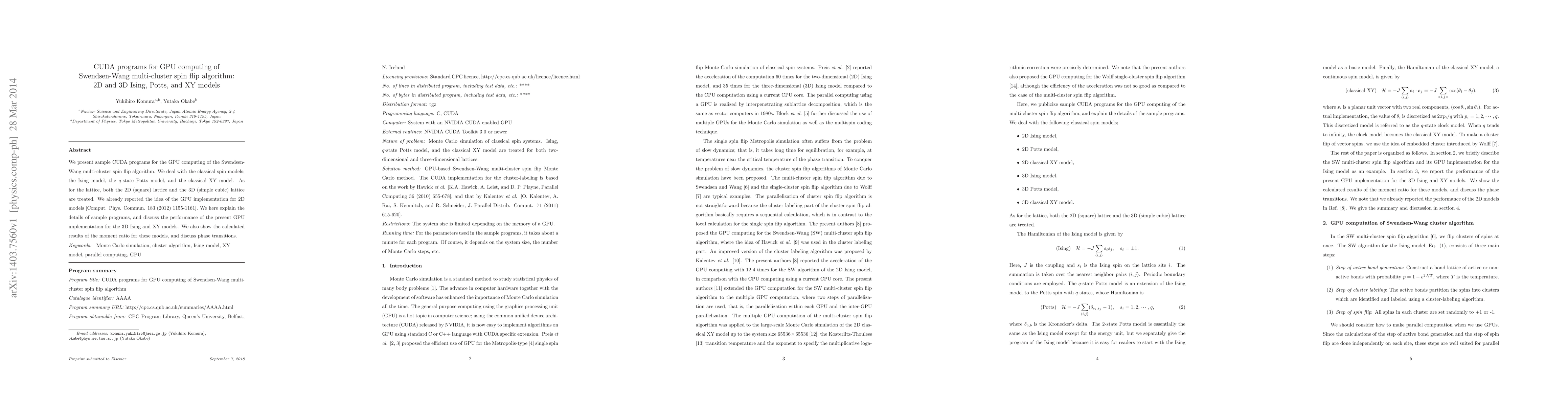This paper presents CUDA programs for GPU computing of the Swendsen-Wang multi-cluster spin flip algorithm applied to the 2D and 3D Ising, Potts, and XY models, detailing the performance and phase transition analysis for the 3D models. The study builds on previous work on 2D models and includes calculated results for the moment ratio.