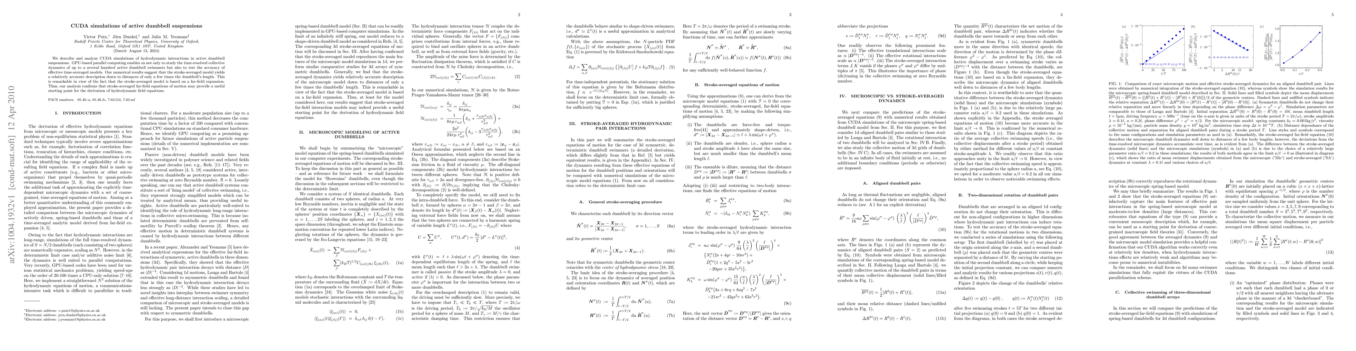We describe and analyze CUDA simulations of hydrodynamic interactions in active dumbbell suspensions. GPU-based parallel computing enables us not only to study the time-resolved collective dynamics of up to a several hundred active dumbbell swimmers but also to test the accuracy of effective time-averaged models. Our numerical results suggest that the stroke-averaged model yields a relatively accurate description down to distances of only a few times the dumbbell's length. This is remarkable in view of the fact that the stroke-averaged model is based on a far-field expansion. Thus, our analysis confirms that stroke-averaged far-field equations of motion may provide a useful starting point for the derivation of hydrodynamic field equations.