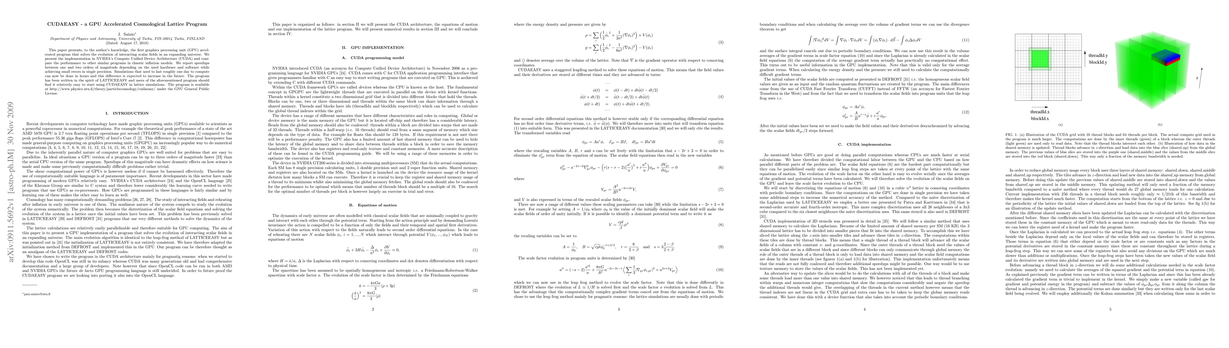 This paper presents, to the author's knowledge, the first graphics processing unit (GPU) accelerated program that solves the evolution of interacting scalar fields in an expanding universe. We present the implementation in NVIDIA's Compute Unified Device Architecture (CUDA) and compare the performance to other similar programs in chaotic inflation models. We report speedups between one and two orders of magnitude depending on the used hardware and software while achieving small errors in single precision. Simulations that used to last roughly one day to compute can now be done in hours and this difference is expected to increase in the future. The program has been written in the spirit of LATTICEEASY and users of the aforementioned program should find it relatively easy to start using CUDAEASY in lattice simulations. The program is available at http://www.physics.utu.fi/theory/particlecosmology/cudaeasy/ under the GNU General Public License.
