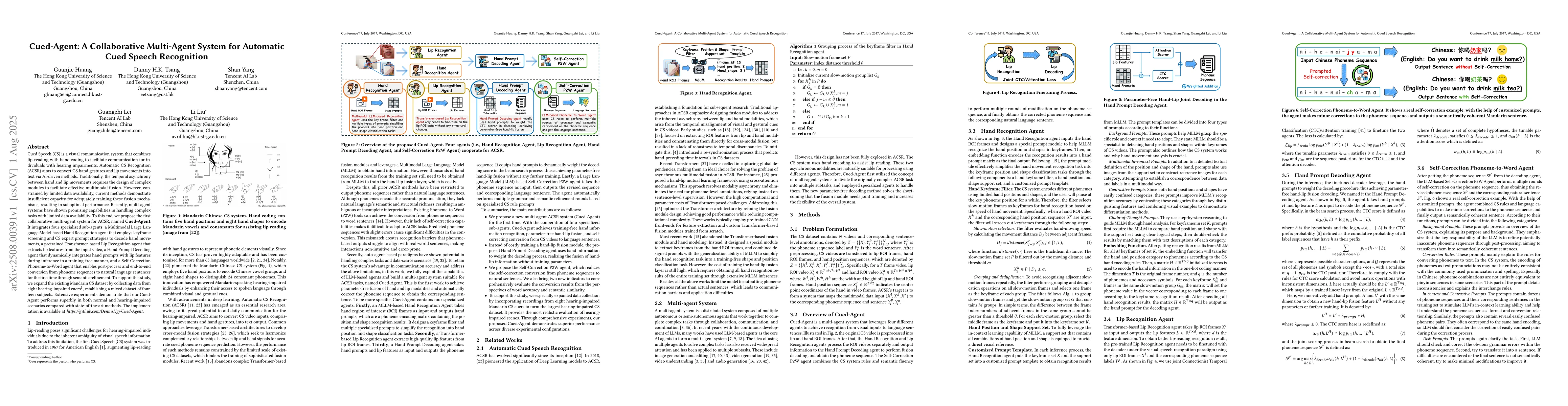 Cued Speech (CS) is a visual communication system that combines lip-reading with hand coding to facilitate communication for individuals with hearing impairments. Automatic CS Recognition (ACSR) aims to convert CS hand gestures and lip movements into text via AI-driven methods. Traditionally, the temporal asynchrony between hand and lip movements requires the design of complex modules to facilitate effective multimodal fusion. However, constrained by limited data availability, current methods demonstrate insufficient capacity for adequately training these fusion mechanisms, resulting in suboptimal performance. Recently, multi-agent systems have shown promising capabilities in handling complex tasks with limited data availability. To this end, we propose the first collaborative multi-agent system for ACSR, named Cued-Agent. It integrates four specialized sub-agents: a Multimodal Large Language Model-based Hand Recognition agent that employs keyframe screening and CS expert prompt strategies to decode hand movements, a pretrained Transformer-based Lip Recognition agent that extracts lip features from the input video, a Hand Prompt Decoding agent that dynamically integrates hand prompts with lip features during inference in a training-free manner, and a Self-Correction Phoneme-to-Word agent that enables post-process and end-to-end conversion from phoneme sequences to natural language sentences for the first time through semantic refinement. To support this study, we expand the existing Mandarin CS dataset by collecting data from eight hearing-impaired cuers, establishing a mixed dataset of fourteen subjects. Extensive experiments demonstrate that our Cued-Agent performs superbly in both normal and hearing-impaired scenarios compared with state-of-the-art methods. The implementation is available at https://github.com/DennisHgj/Cued-Agent.