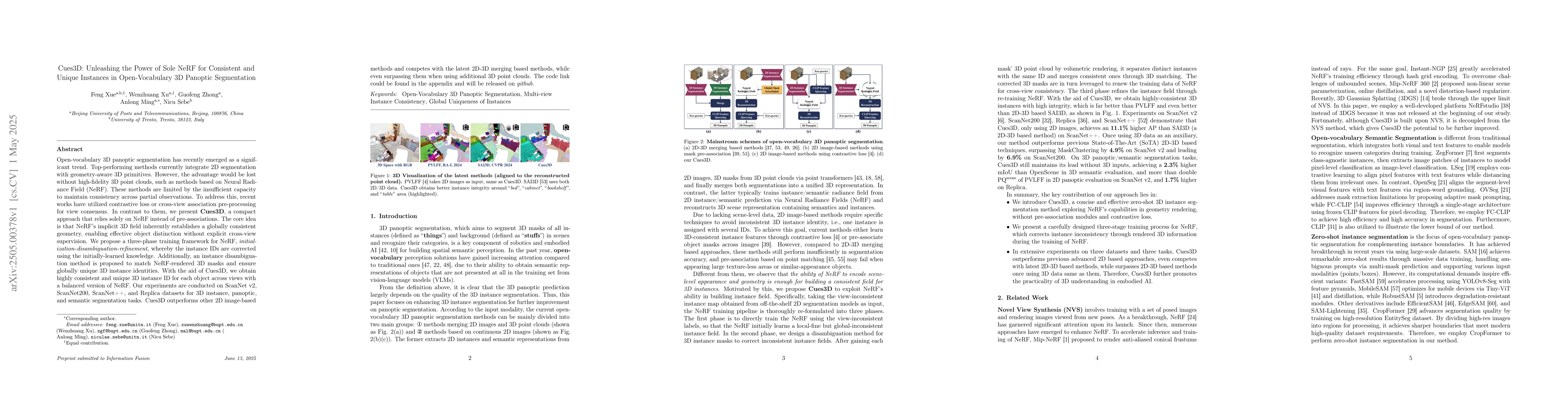 This research is significant as it presents a compact approach that relies solely on NeRF, unlike previous works that utilized contrastive loss or cross-view association pre-processing for view consensus. Cues3D ensures globally consistent geometry and effective object distinction without explicit cross-view supervision, making it a valuable contribution to open-vocabulary 3D panoptic segmentation.