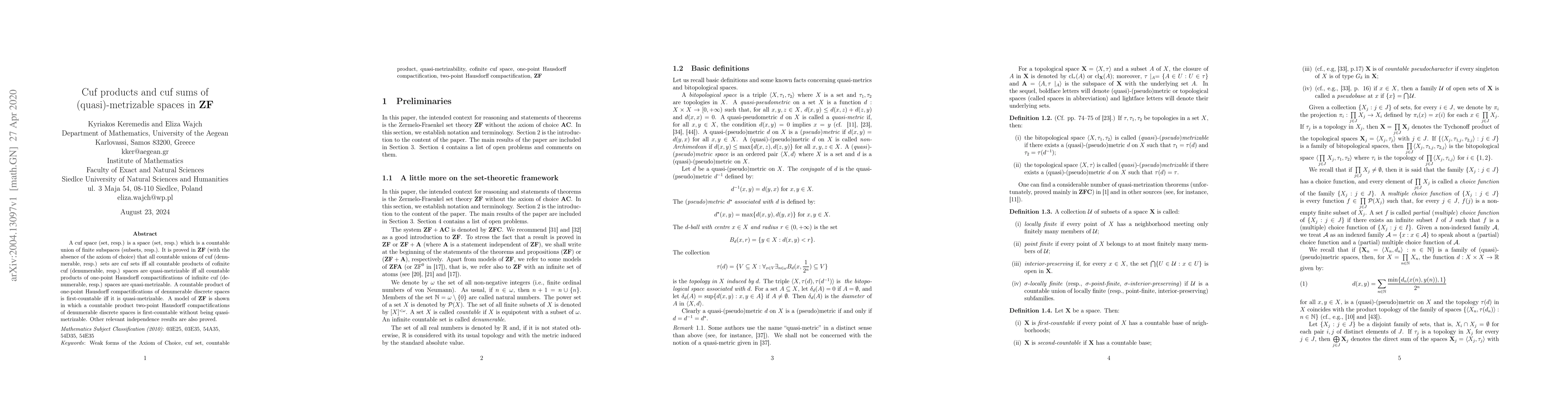 In ZF, the paper establishes relationships between cuf (countable union of finite) spaces and their products, showing that countable unions of cuf sets remain cuf if and only if certain products of cofinite cuf spaces are quasi-metrizable. It also proves independence results regarding the quasi-metrizability of products of compactifications of denumerable spaces.