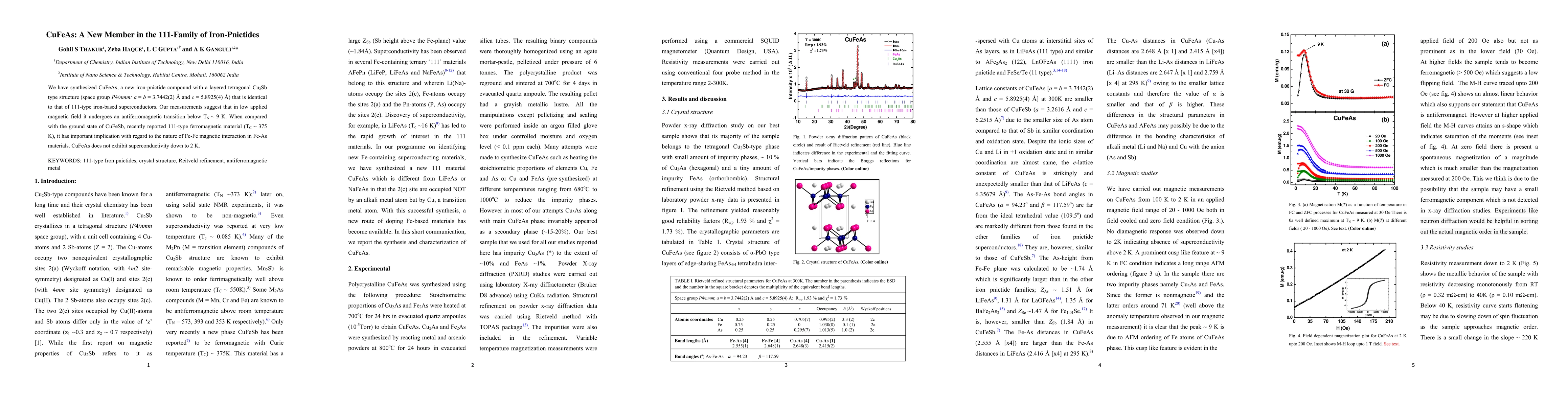 We have synthesized CuFeAs, a new iron-pnictide compound with a layered tetragonal Cu2Sb type structure (space group P4/nmm: a = b = 3.7442(2) {\AA} and c = 5.8925(4) {\AA}) that is identical to that of 111-type iron-based superconductors. Our measurements suggest that in low applied magnetic field it undergoes an antiferromagnetic transition below TN ~ 9 K. When compared with the ground state of CuFeSb, recently reported 111-type ferromagnetic material (TC ~ 375 K), it has important implication with regard to the nature of Fe-Fe magnetic interaction in Fe-As materials. CuFeAs does not exhibit superconductivity down to 2 K.