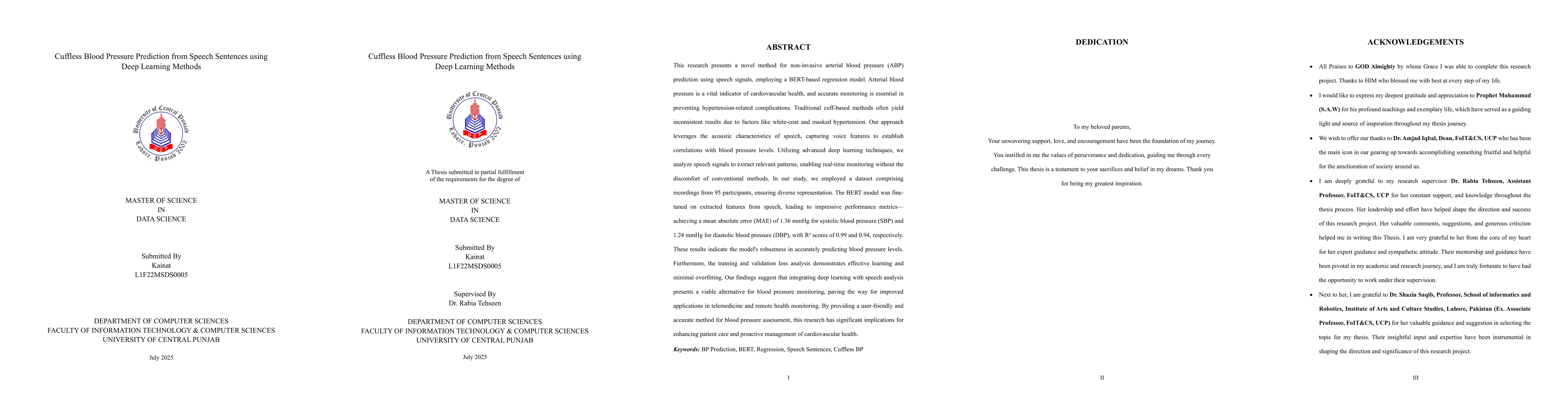 This research presents a novel method for noninvasive arterial blood pressure ABP prediction using speech signals employing a BERT based regression model Arterial blood pressure is a vital indicator of cardiovascular health and accurate monitoring is essential in preventing hypertension related complications Traditional cuff based methods often yield inconsistent results due to factors like whitecoat and masked hypertension Our approach leverages the acoustic characteristics of speech capturing voice features to establish correlations with blood pressure levels Utilizing advanced deep learning techniques we analyze speech signals to extract relevant patterns enabling real time monitoring without the discomfort of conventional methods In our study we employed a dataset comprising recordings from 95 participants ensuring diverse representation The BERT model was fine tuned on extracted features from speech leading to impressive performance metrics achieving a mean absolute error MAE of 136 mmHg for systolic blood pressure SBP and 124 mmHg for diastolic blood pressure DBP with R scores of 099 and 094 respectively These results indicate the models robustness in accurately predicting blood pressure levels Furthermore the training and validation loss analysis demonstrates effective learning and minimal overfitting Our findings suggest that integrating deep learning with speech analysis presents a viable alternative for blood pressure monitoring paving the way for improved applications in telemedicine and remote health monitoring By providing a user friendly and accurate method for blood pressure assessment this research has significant implications for enhancing patient care and proactive management of cardiovascular health
