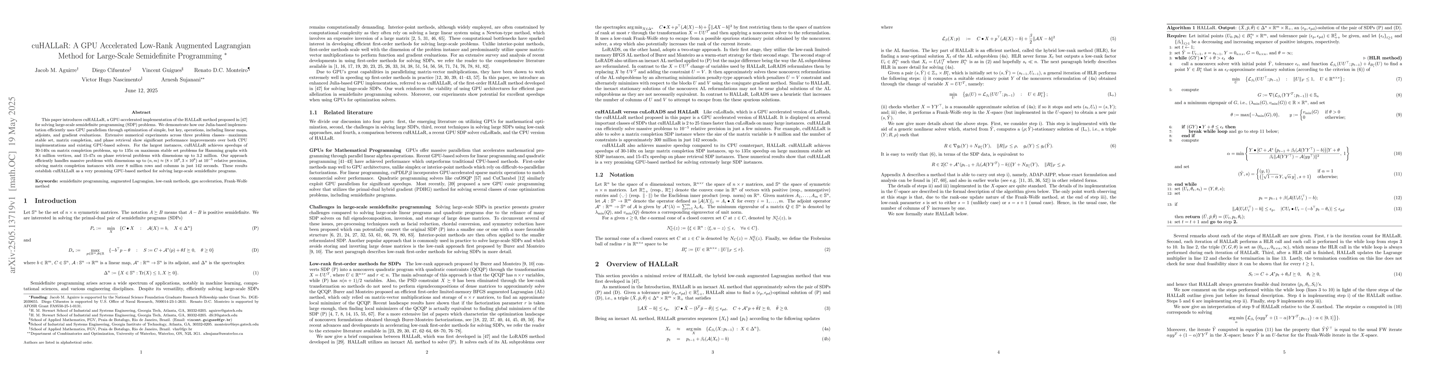 cuHALLaR, a GPU-accelerated method, solves large-scale semidefinite programming problems with significant speedups over CPU and existing GPU solvers.