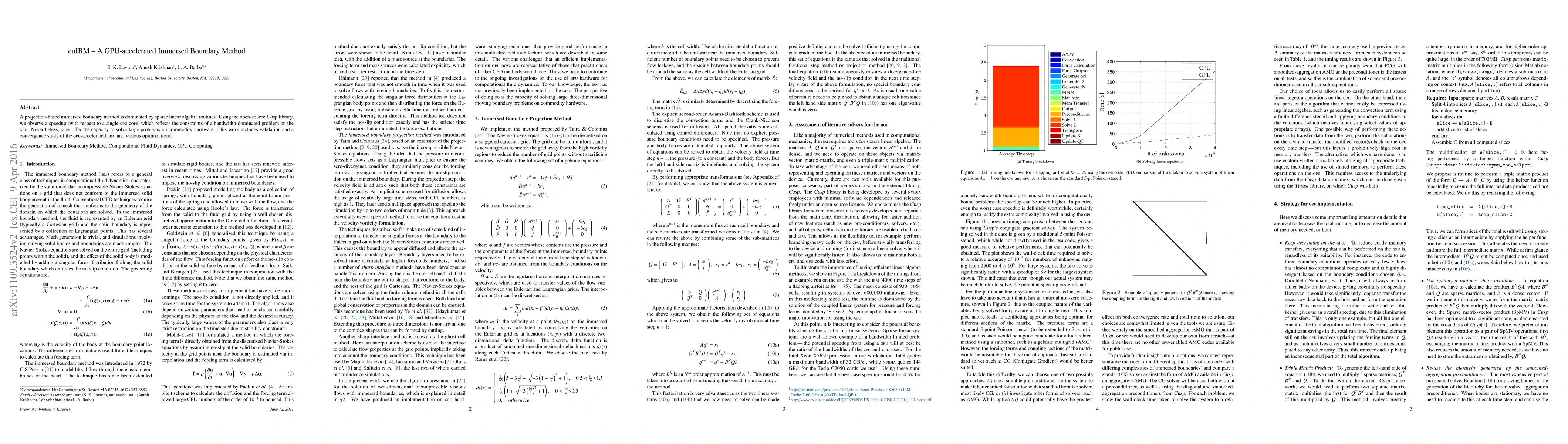 Summary: This paper presents a GPU-accelerated version of the Immersed Boundary Method (IBM) using the Cusp library, achieving significant speedups over CPU cores, and includes validation, convergence studies, and optimization techniques to solve large problems efficiently on commodity hardware.