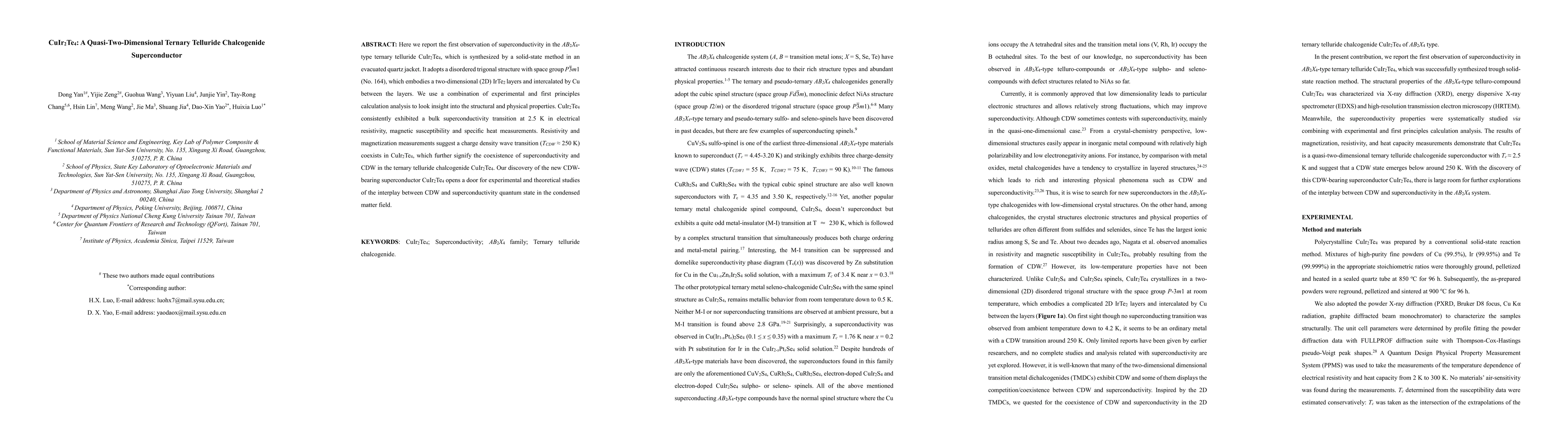 This paper reports the first observation of superconductivity in CuIr2Te4, a quasi-two-dimensional ternary telluride, which exhibits bulk superconductivity at 2.5 K alongside a charge density wave transition at 250 K. The findings open new avenues for studying the coexistence of superconductivity and charge density waves.