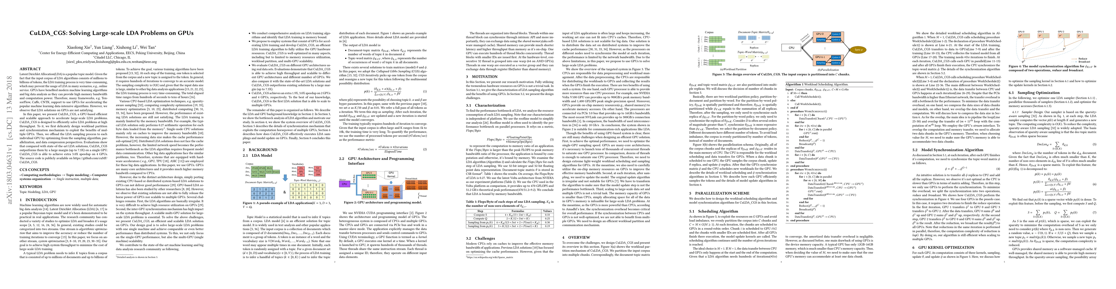 This paper introduces CuLDA_CGS, a GPU-based approach to accelerate large-scale LDA problems, optimizing workload partition, synchronization, and sampling algorithms for multiple GPUs. Evaluations show significant performance improvements, up to 7.3X faster on a single GPU and 3.0X on 4 GPUs compared to state-of-the-art solutions.